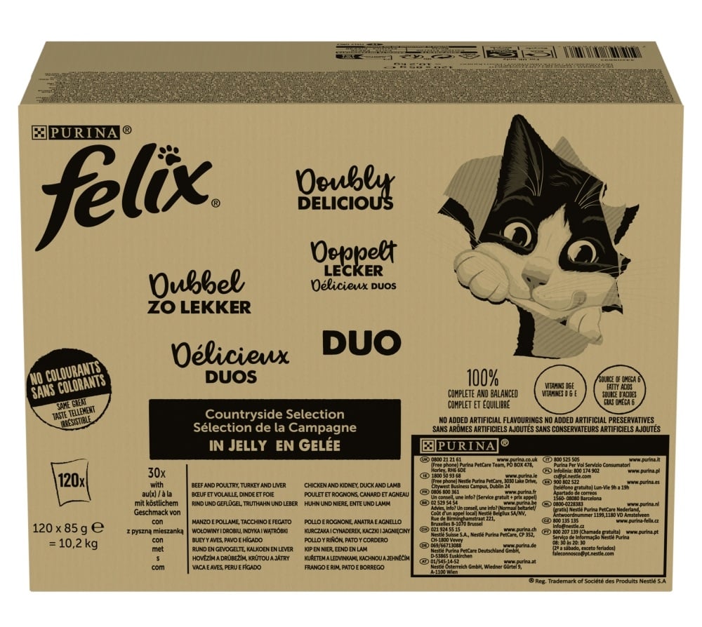 Felix Fantastic DUO Mix Vidiecke chute v želé je kompletné mokré krmivo pre dospelé mačky, ktoré ponúka kombinácie dvoch chutí v každom jedle: hovädzie a hydina, moriak a pečeň, kurča a obličky, ako aj kačica a jahňacina.