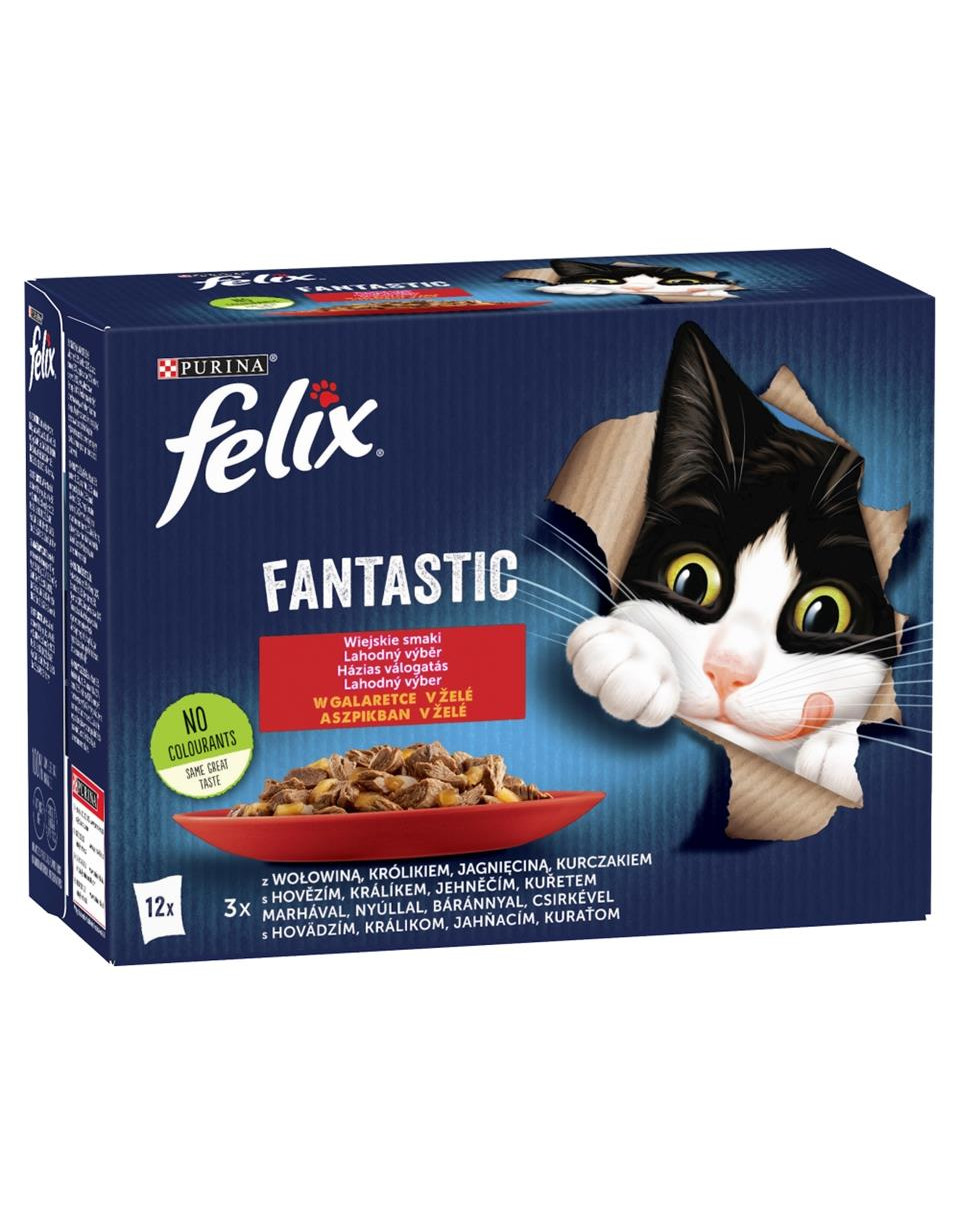 Kompletné krmivo s rôznymi druhmi mäsa v želé pre dospelé mačky.