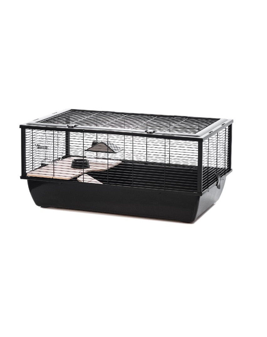 Klietka pre hlodavce. Funguje dobre pre zvieratá, ako je škrečok alebo morča. Vyrobené z netoxických materiálov: prášková farba, bez olova, certifikované - bezpečné pre zvieratá. Klietka obsahuje koterec, misku a domček z plastu. Má tiež plne otvárateľnú strechu a drevenú policu s rebríkom.