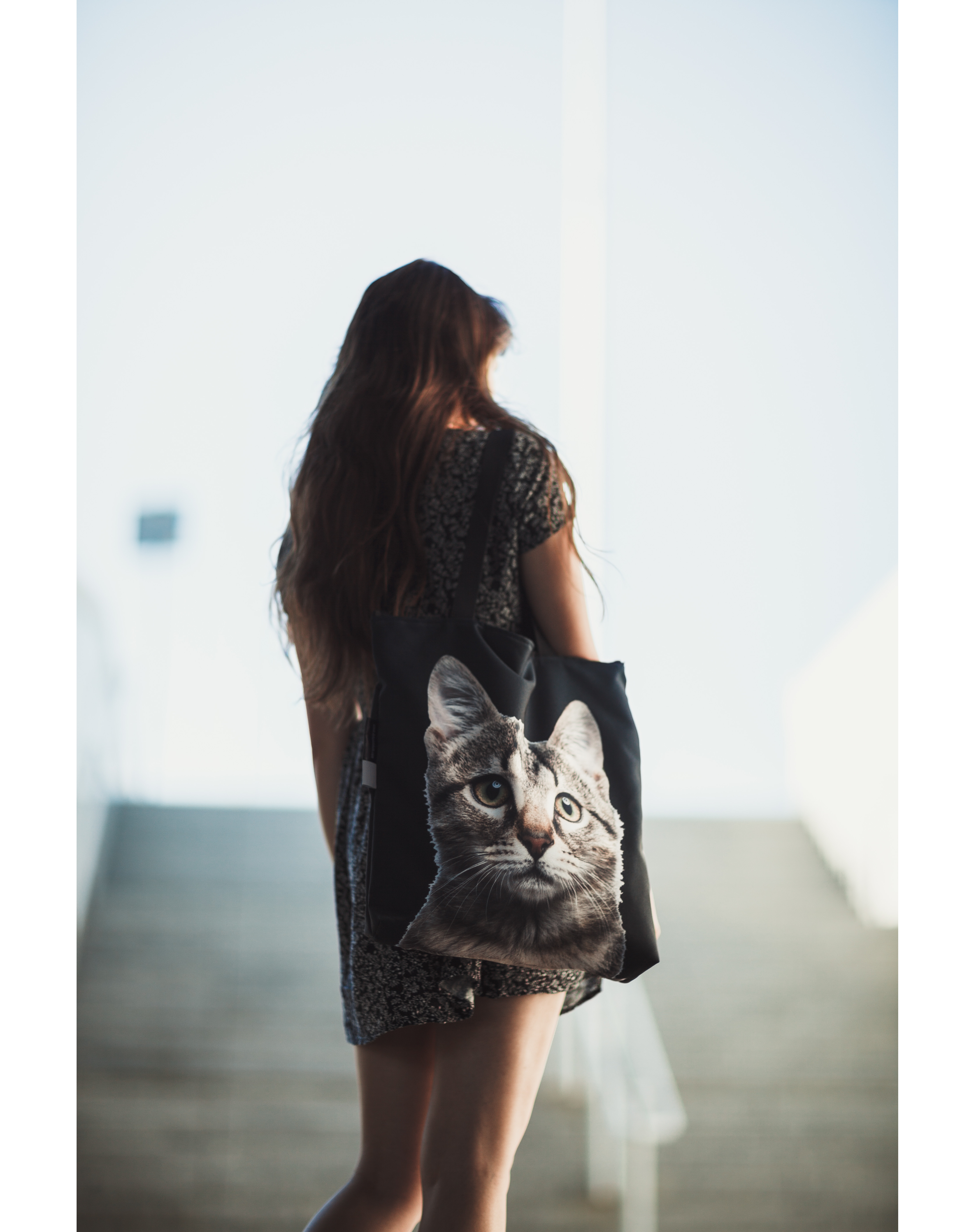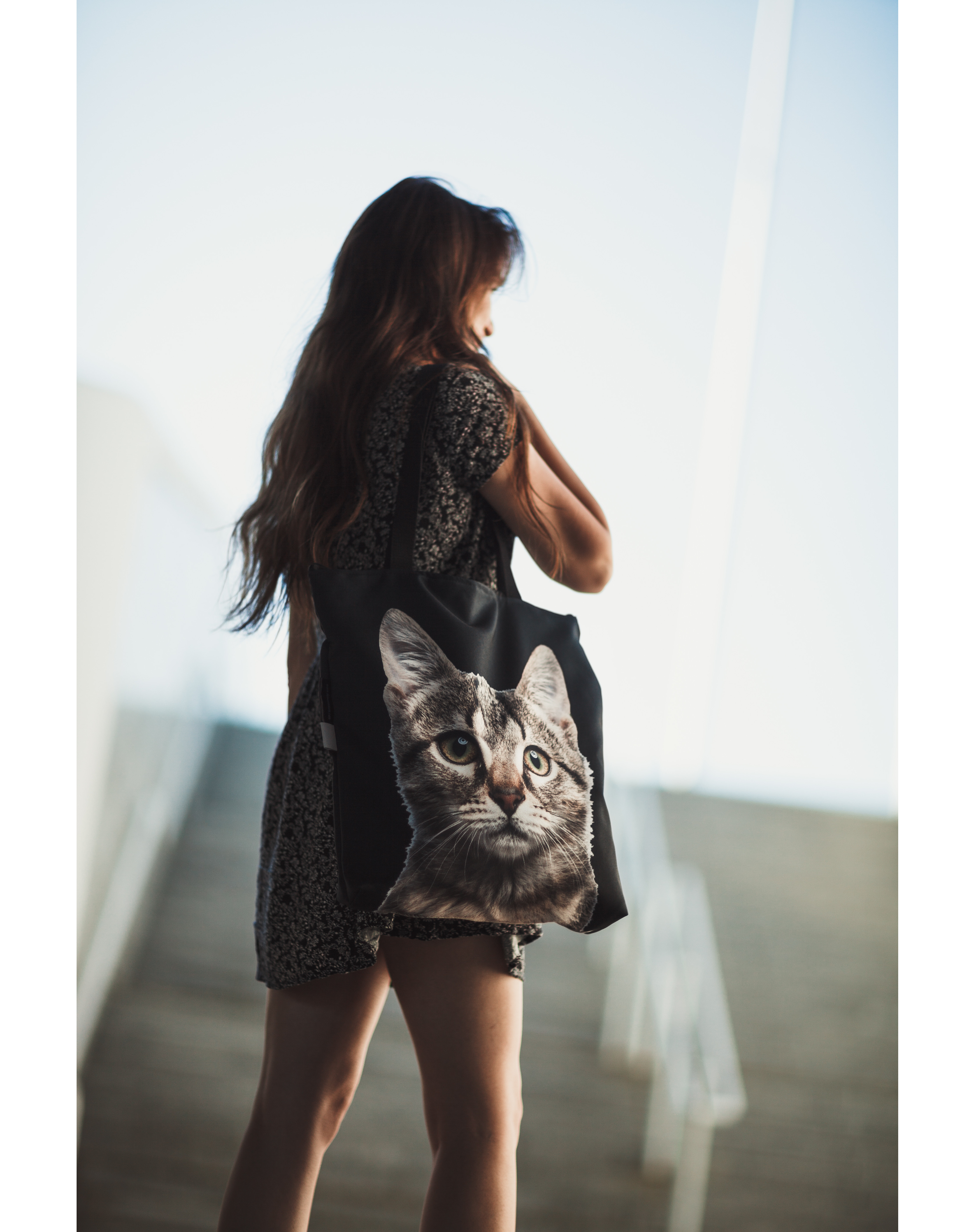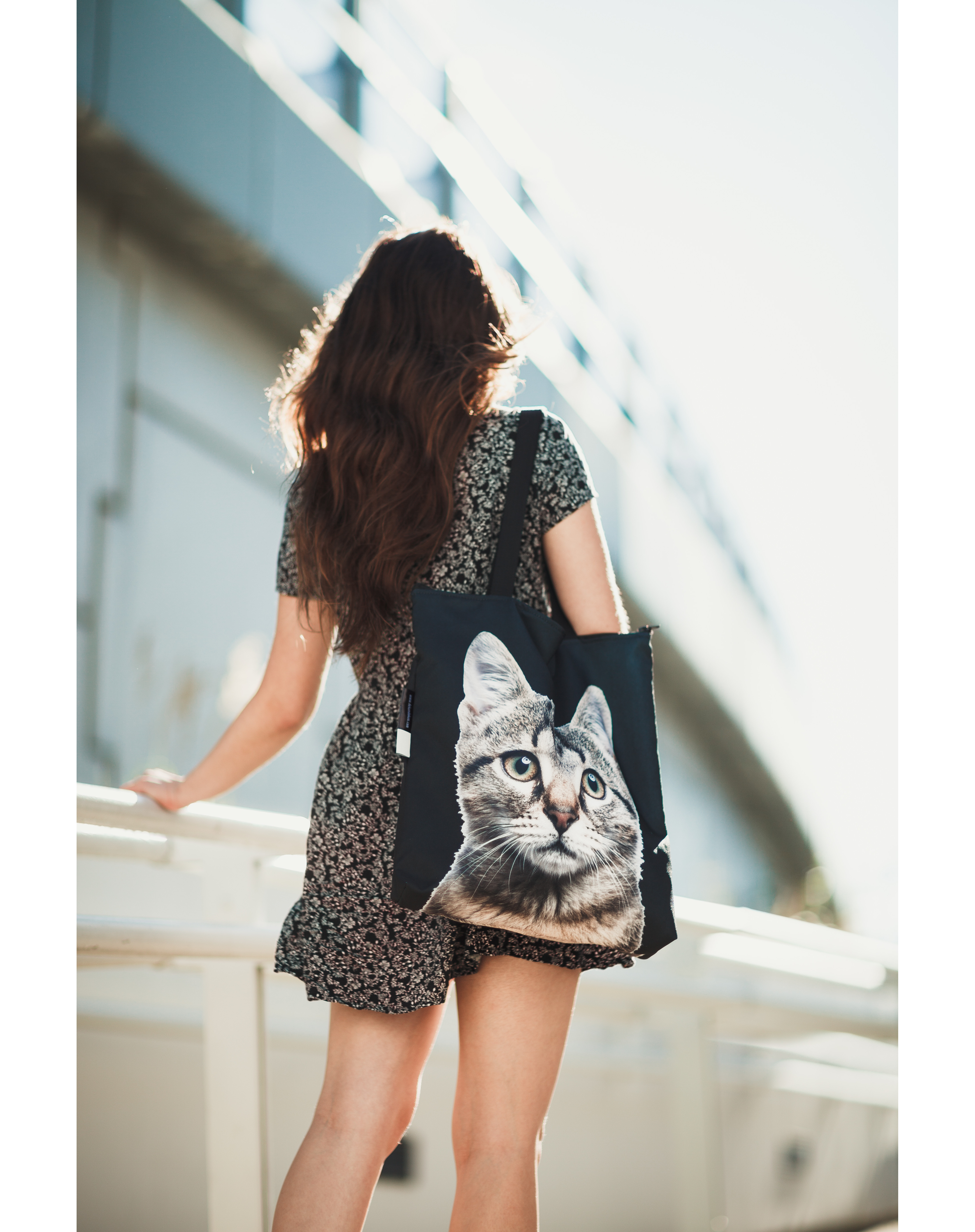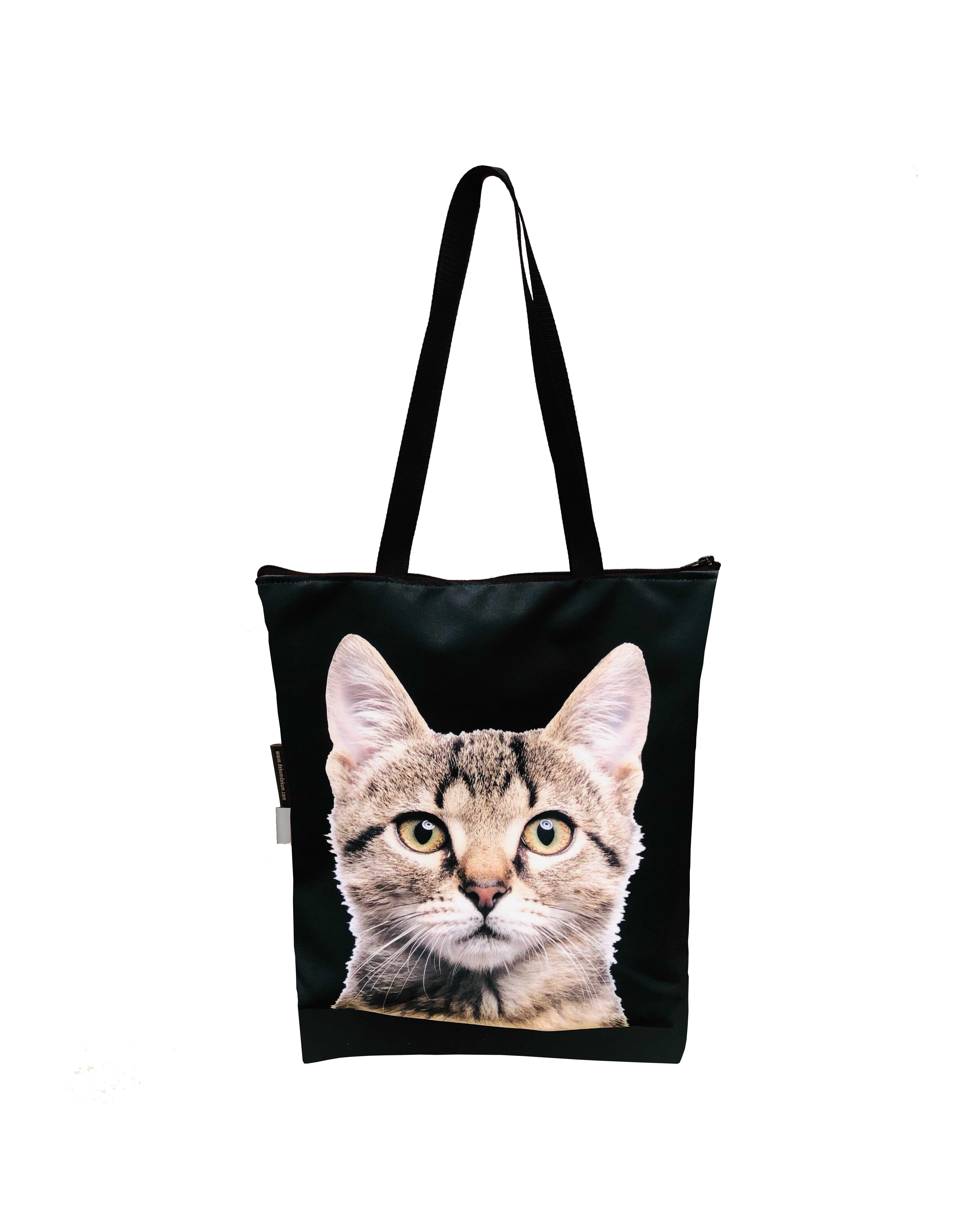 Nákupná taška s uzatvárateľným zipsom a motívom šedej mačky.