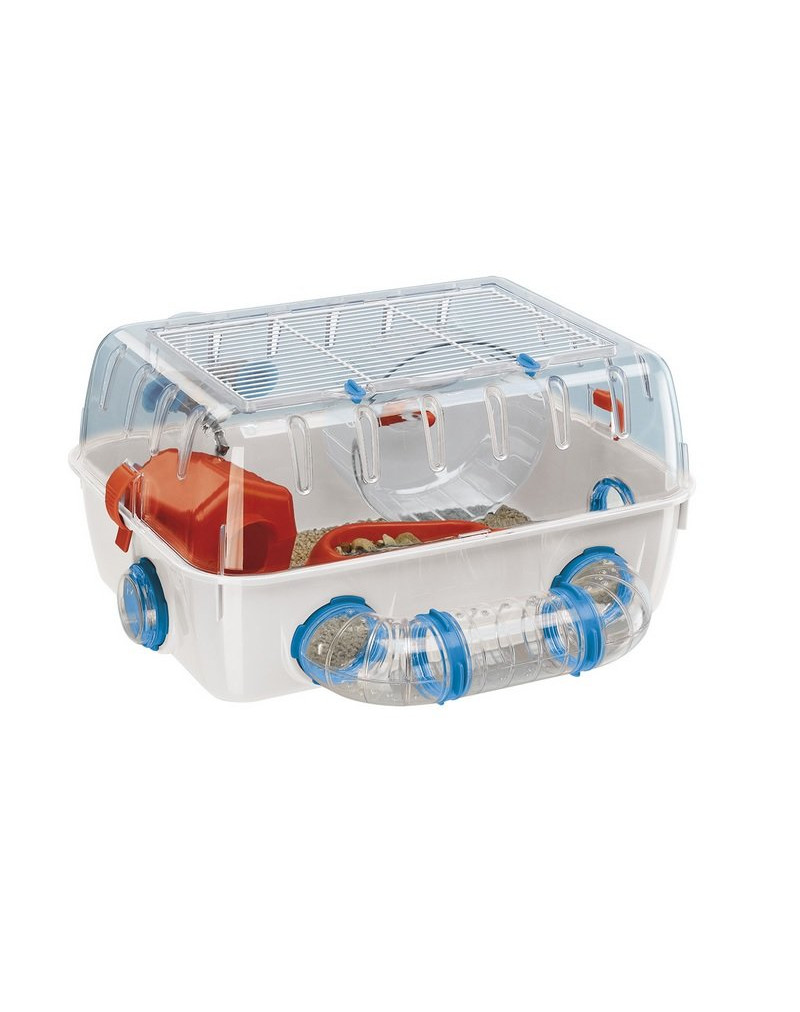 Oryginalna klatka dla chomika wyposażona w tunel, kołowrotek, poidełko, miskę i domek. Łatwa w czyszczeniu, dzięki zdejmowanej podstawie. Wymiary 40.5 x 29.5 x 22.5 cm.