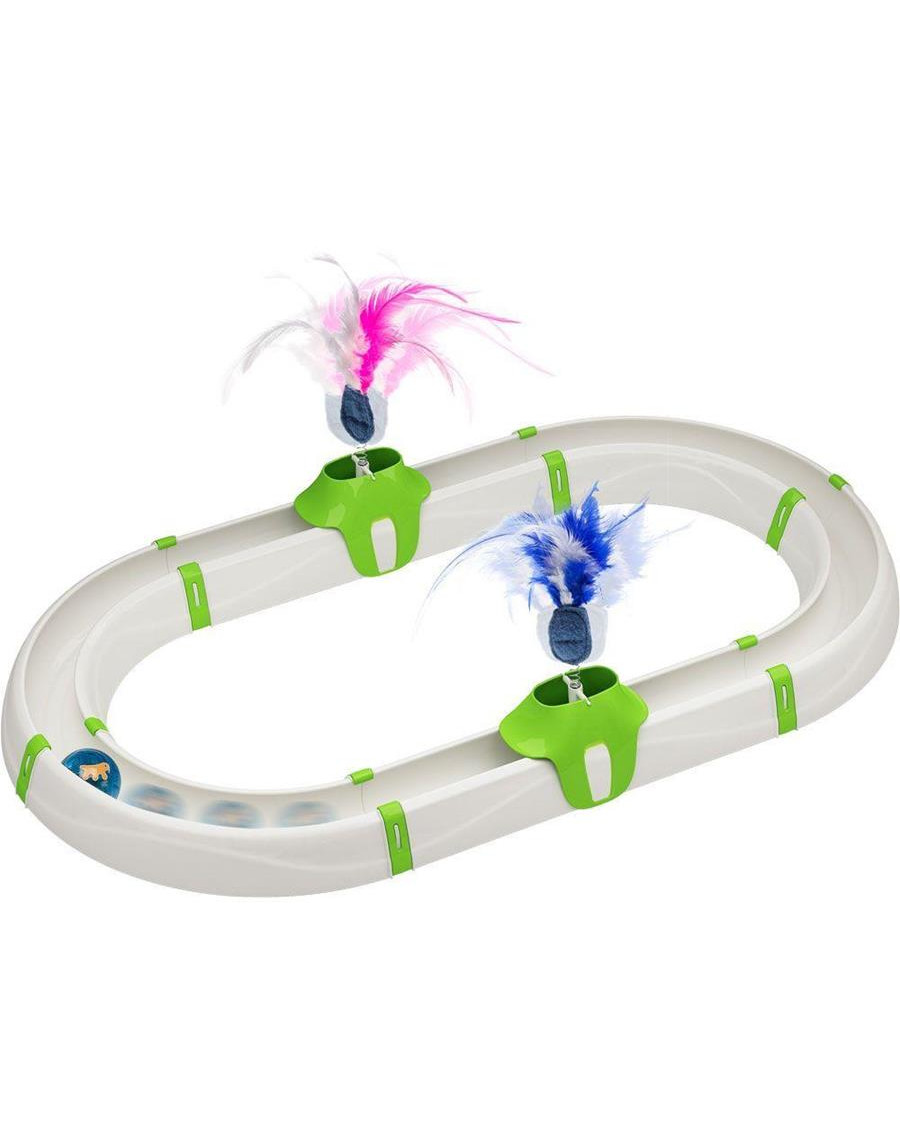 Hračka v tvare závodnej dráhy pre mačku, v sade s malou svietiacou loptičkou s dvoma pierkami.