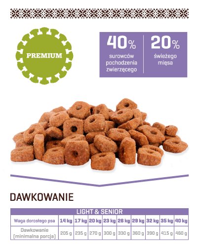 Krmivo má menej kalórií, vďaka čomu uľahčuje redukciu telesnej hmotnosti a pomáha udržiavať psov so sklonom k priberaniu na ideálnej telesnej hmotnosti. S vekom sa spomaľuje proces trávenia, oslabuje metabolizmus a znižuje ochota hrať sa. Vek taktiež môže spôsobiť nadmerný nárast telesnej hmotnosti a hyperpláziu. Nenasýtené mastné kyseliny omega-3 a omega-6 priaznivo ovplyvňujú srdce, oči a srsť zvieraťa.