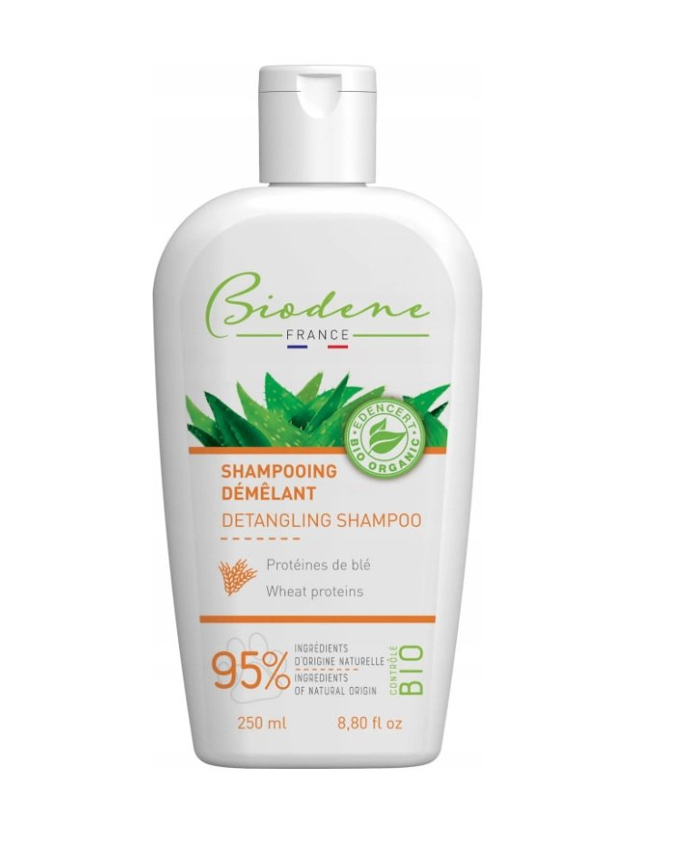 Prírodný šampón podporujúce ľahké rozčesávanie postrapatenej srsti a zdravú kožu. Uhladzujúci efekt je zaistený vďaka pšeničným proteínom. Lesk psej srsti je dosiahnutý vďaka betaínu. Šampon Biodene obsahuje pšeničné proteíny pre ich uhladzujúci vlastnosti a betaín pre silu a lesk. Pre dosiahnutie väčšieho účinku odporúčame pravidelné používanie.