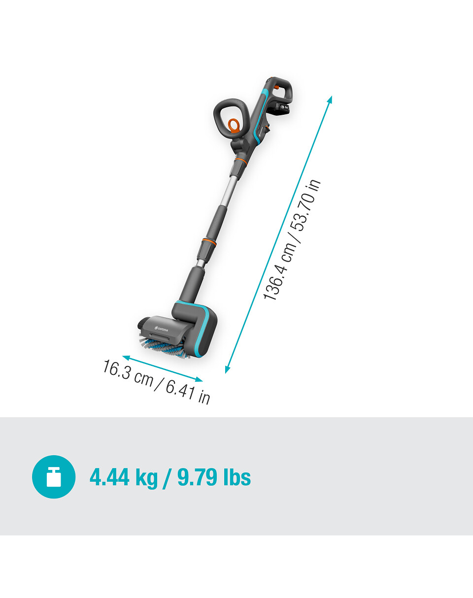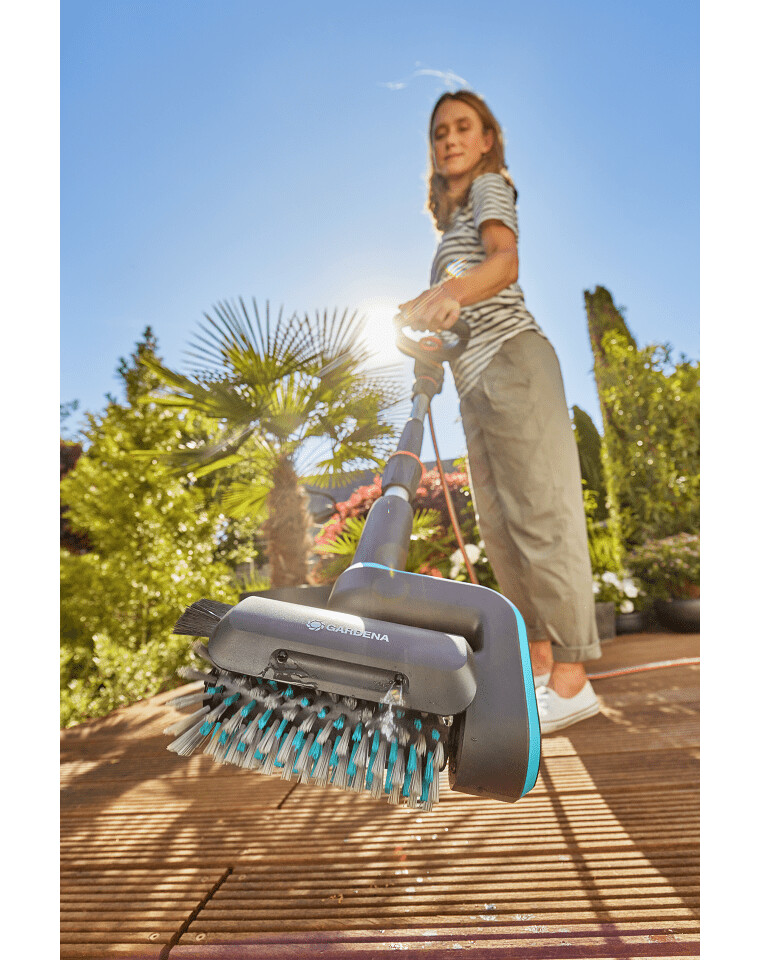 GARDENA akumulátorová kefa na terasy AquaBrush - sada na jednoduché čistenie dreva, PVC, kameňa, terás, palúb a nerovných povrchov.
