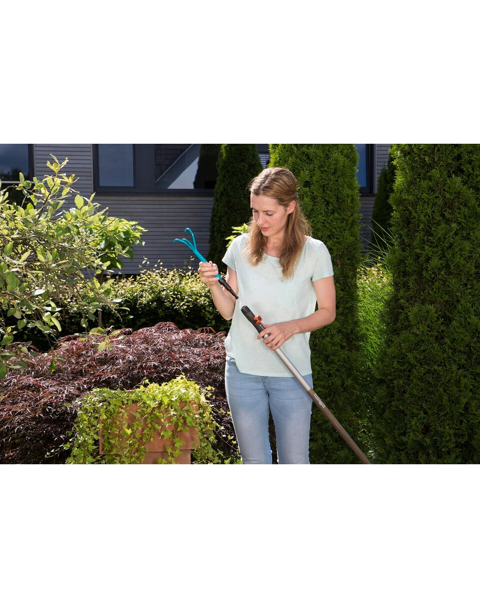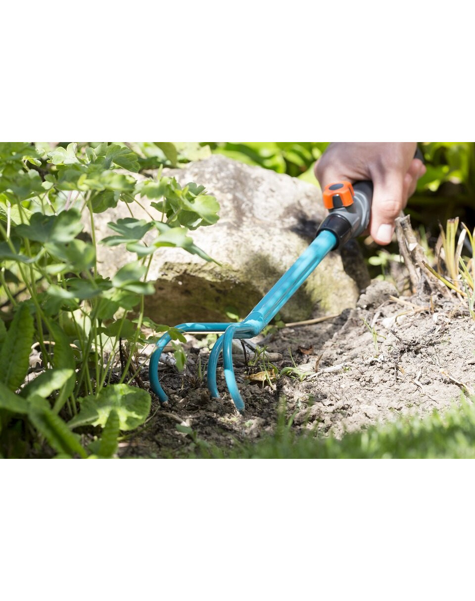 Pomocouveľkých pazúrov z radu GARDENA combisystem možno ľahko kypriť a prevzdušňovať pôdu. Vďaka vymeniteľným nástrojom poskytuje GARDENA combisystem flexibilitu pri používaní. Veľké pazúry sú kompatibilné so všetkými násadami GARDENA combisystem a možno ich ľahko pripevniť k násade. Ak chcete pracovať pohodlne a bez ohýbania, jednoducho odoberte násadu a vymeňte ju za násadu kombinovaného systému. Predlžovacia násada Combisystem je ideálna na predlžovanie ručného náradia. Bezpečné spojenie medzi násadou a pazúrom zaisťuje pohodlnú prácu v každej situácii. Vďaka ergonomickej rukoväti s mäkkými komponentmi náradie dokonale padne do ruky a zakrivenie rukoväte zabraňuje skĺznutiu náradia. Veľké pazúry so šírkou 7 cm sú vyrobené z kvalitnej ocele a povrchová úprava z termosetového plastu zaručuje vysokú odolnosť. Na úsporu miesta pri skladovaní pazúrikov možno použiť vešiak na náradie combisystem Flex.