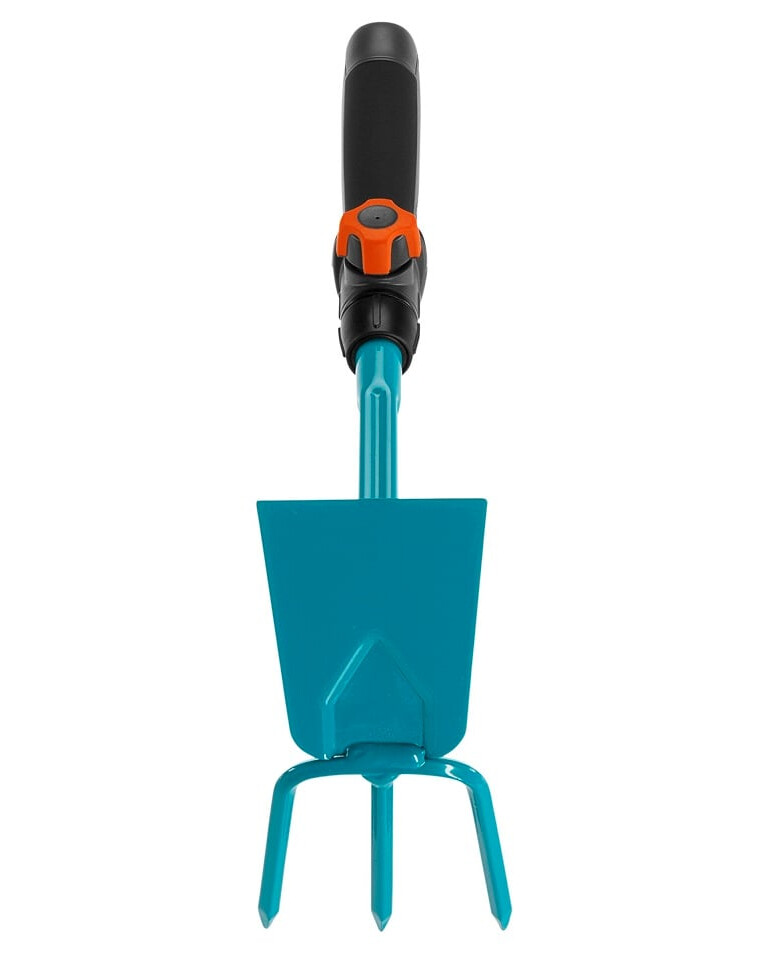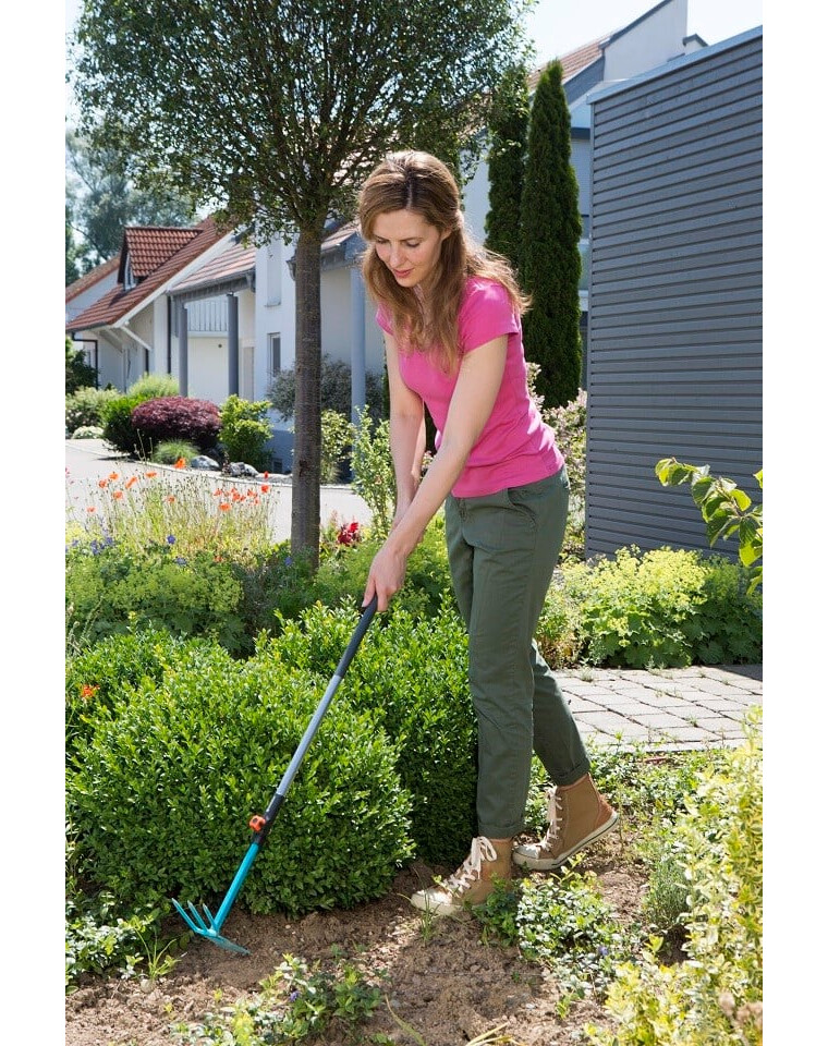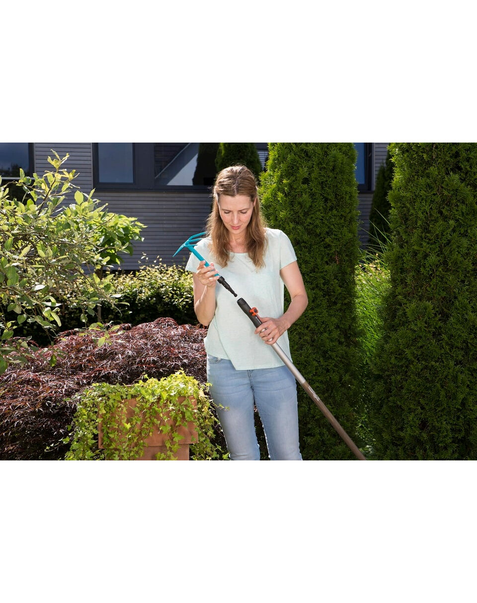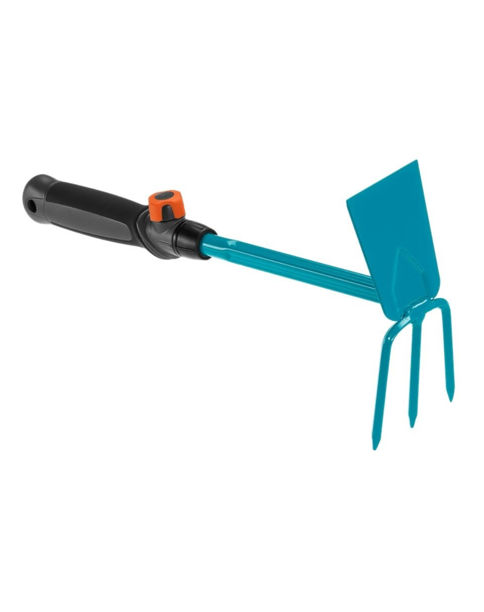 GARDENA Combisystem - jednoduchá motyčka na kyprenie, prevzdušňovanie a odstraňovanie buriny. GARDENA Combisystem umožňuje flexibilné použitie vďaka vymeniteľným nástrojom. Motyka je kompatibilná so všetkými násadami GARDENA Combisystem a možno ju jednoducho pripojiť k násade. Ak chcete pracovať pohodlne a bez ohýbania, jednoducho odoberte násadu a nahraďte ju násadou Combination System. Predlžovacia násada Combisystem (č. výr. 8900-20) je ideálna na predĺženie ručného náradia. Bezpečné pripojenie motyky k násade zaručuje pohodlnú prácu v každej situácii. Ergonomicky tvarovaná rukoväť s mäkkými komponentmi zaručuje pohodlné používanie a jej zakrivenia zabraňujú skĺznutiu náradia. Praktická rovná motyka má na jednej strane tri zuby a na druhej strane rovnú čepeľ. Pracovná šírka je 6,5 cm. Vďaka vysokokvalitnej termosetovej oceli potiahnutej plastom je rovná motyka odolná proti korózii a mimoriadne trvanlivá. Combisystem - flexibilný záves na náradie umožňuje pohodlné uloženie motyky.