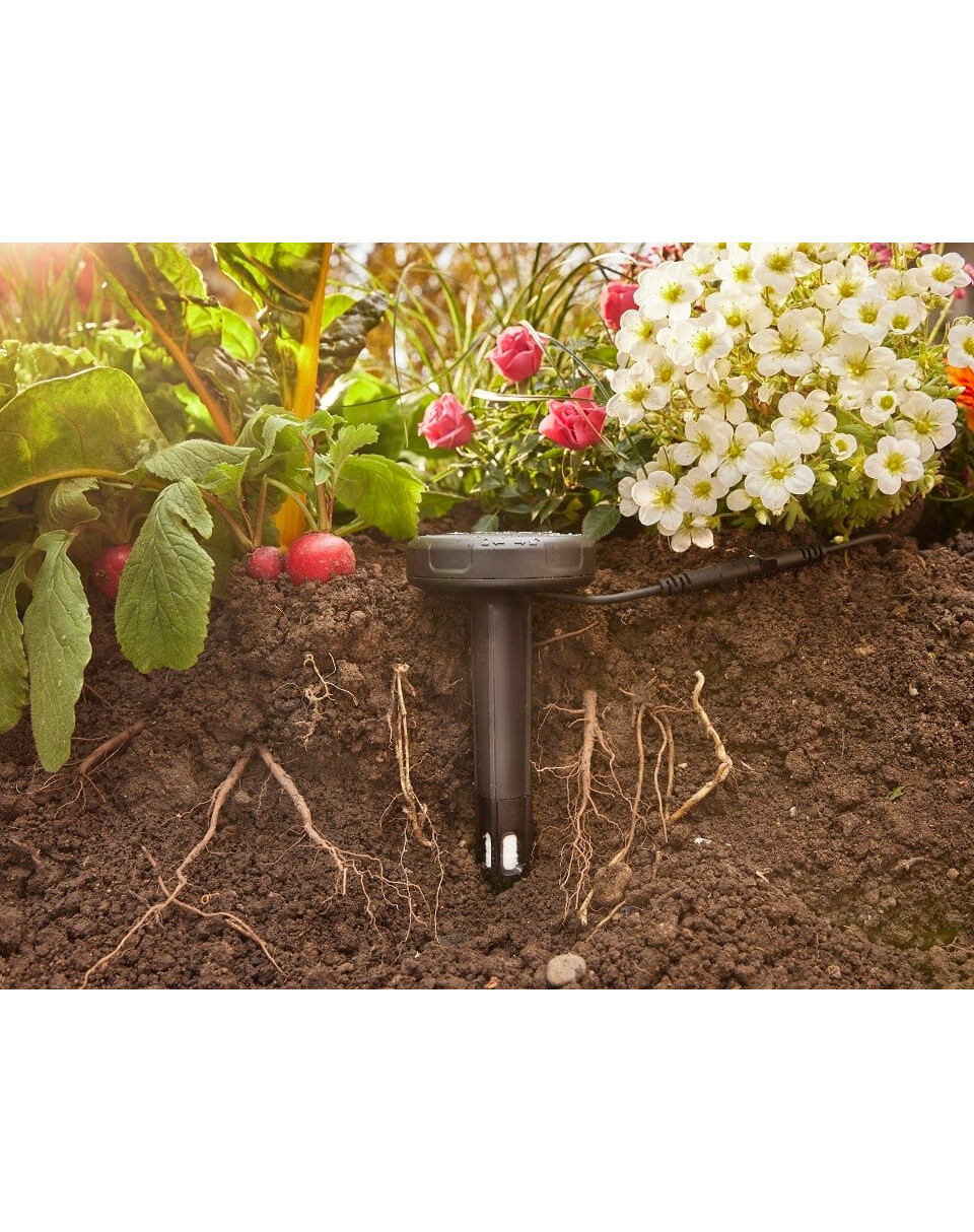 Na záhony, trávniky alebo dokonca do kvetinových truhlíkov: malý, kompaktný dizajn a 5 m kábel umožňujú umiestniť snímač pôdnej vlhkosti takmer kdekoľvek v záhrade. Nízka výška a plochá horná časť umožňujú montáž snímača na trávnik bez toho, aby zasahoval do činnosti kosačky.