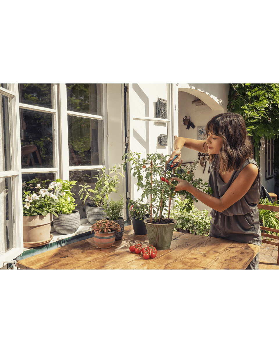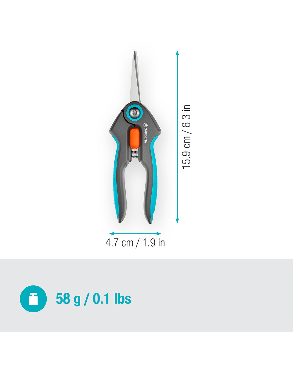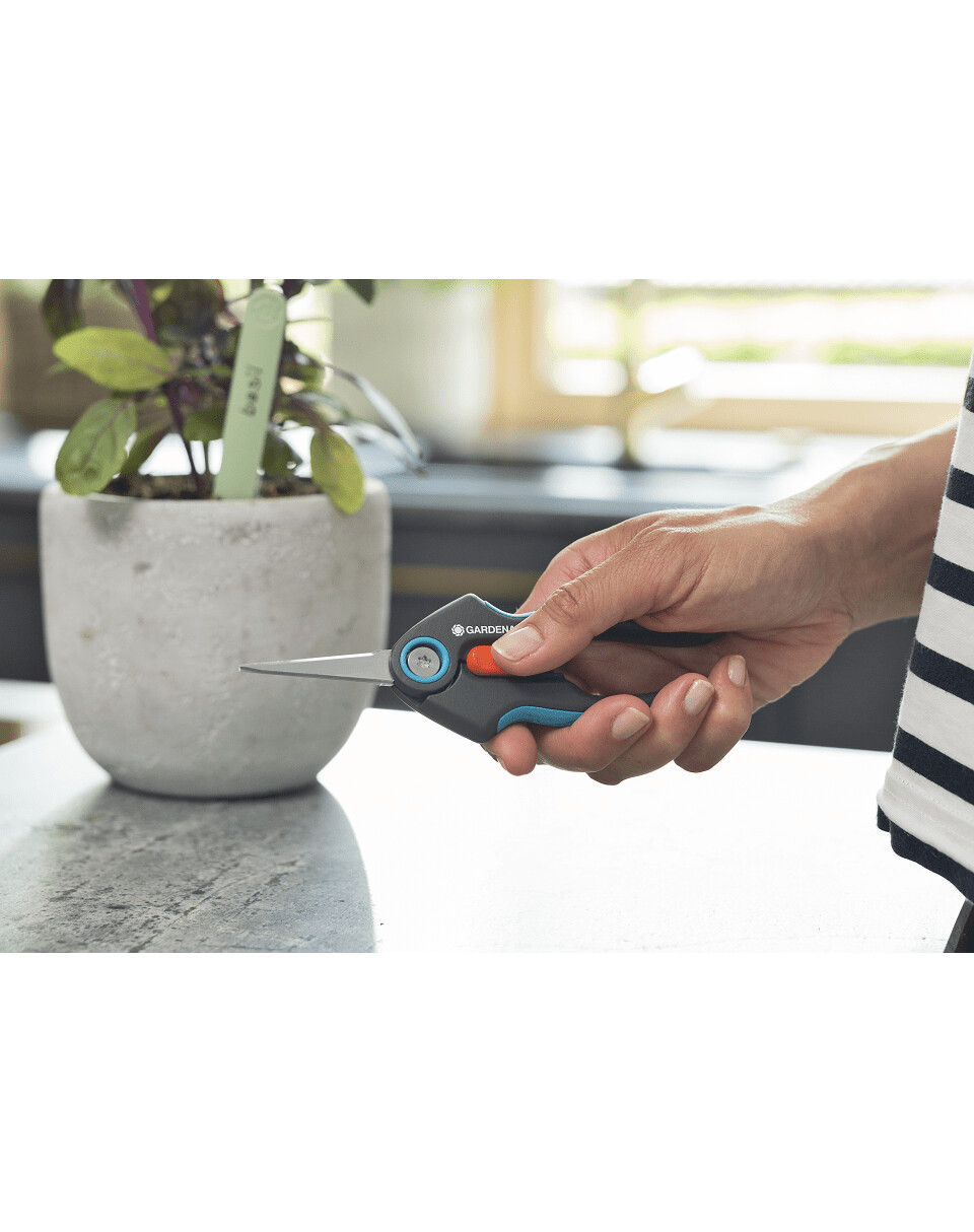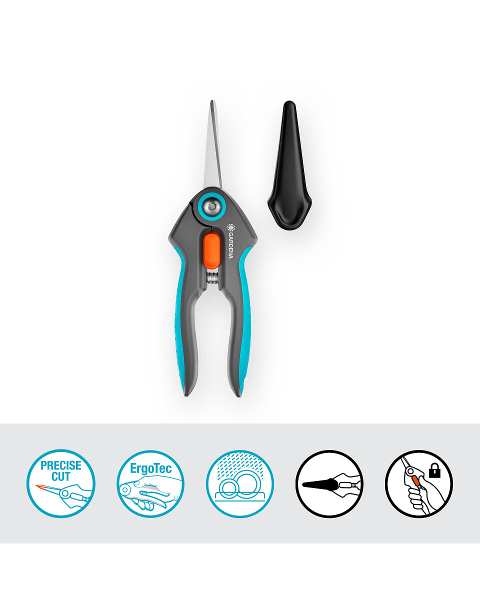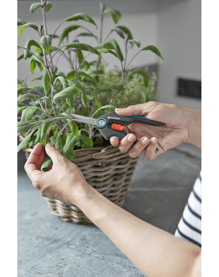 Nožnice GARDENA FreshCut sú ideálne na zber čerstvých byliniek a plodov, ako aj na strihanie kvetov. Úzka a ostrá čepeľ je vyrobená z odolnej ocele odolnej voči korózii a poteší pri každom strihu. Nožnice FreshCut strihajú čisto a presne až po špičku. Nožnice na bylinky a zeleninu dobre fungujú aj v malých priestoroch, takže môžete ľahko zbierať bazalku alebo zvädnuté kvety. Pohodlne a bezpečne sa držia v ruke vďaka ergonomickej protišmykovej rukoväti ErgoTec a mäkkej rukoväti. Na bezpečné skladovanie a prepravu nasaďte na priložené nožnice priložený bezpečnostný kryt. Mechanizmus uzamykania jednou rukou umožňuje nožnice ľahko uzamknúť a odomknúť. Bez ohľadu na typ strihanej rastliny čepele schválené pre potravinárske účely neovplyvnia chuť ani vôňu potravín. Na jednoduché čistenie sú nožnice vhodné do umývačky riadu.