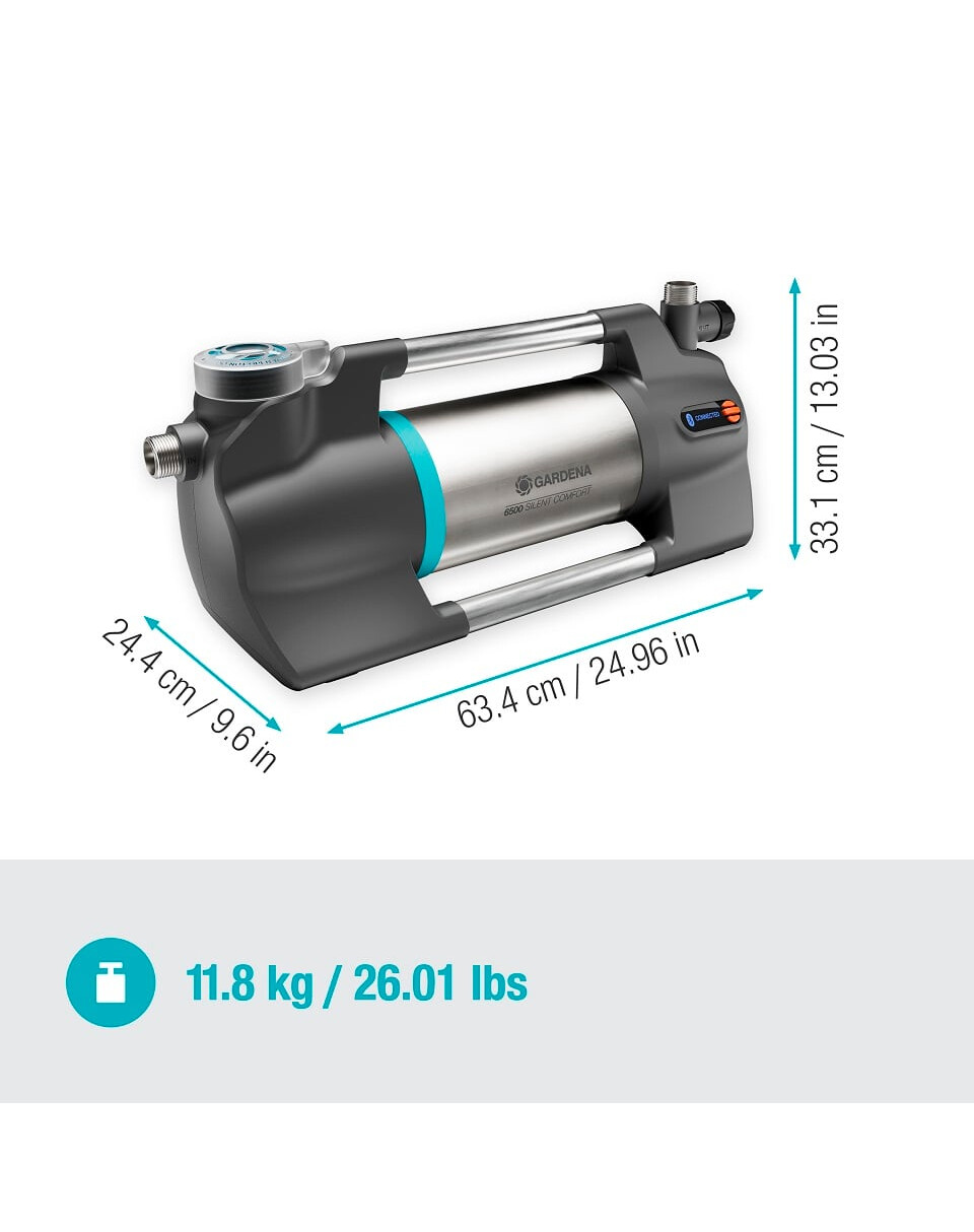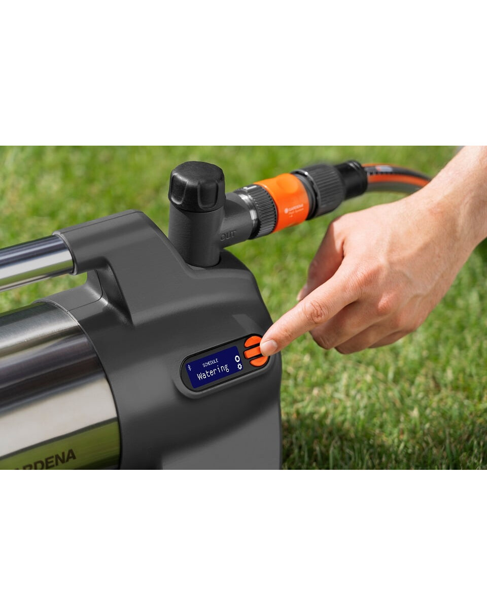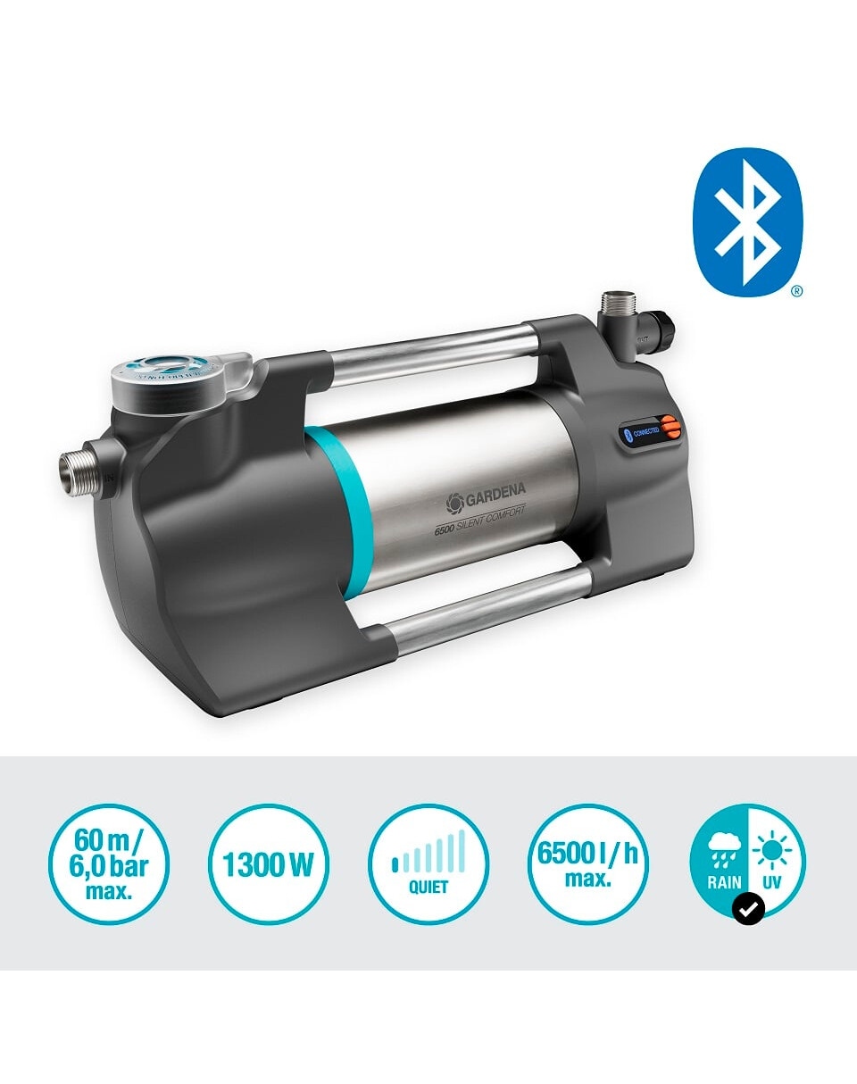 Čerpadlo je pôsobivo energeticky účinné a poskytuje najlepší výkon vo svojej triede. Vďaka vysoko účinnému hydraulickému systému spotrebuje 1 300 W energie a poskytuje neuveriteľný prietok 6 500 l/h a výšku 60 m (6 barov). Možno ho použiť na zber vody zo sudov na dážď, studní alebo cisterien až do hĺbky 8 metrov. Vďaka inovatívnej viacstupňovej prevádzke a vodnému chladeniu je toto nemecké čerpadlo SilentComfort mimoriadne tiché, s hladinou akustického tlaku len 46 db(A) vo vzdialenosti 5 m. Táto technológia nevyžaduje ventilátor, pretože teplo sa odvádza do vody. Tým sa zabezpečuje maximálna účinnosť a minimálna hladina hluku. S výnimkou vytvorenia plánu zavlažovania možno všetky funkcie nastaviť prostredníctvom podsvieteného LCD displeja zariadenia, ktorý umožňuje aj jeho zapnutie a vypnutie. Tento zámok zabraňuje náhodnému spusteniu čerpadla deťmi. Vďaka pripojeniu Bluetooth možno čerpadlo ovládať na vzdialenosť až 10 m a využívať dostupné doplnkové funkcie. Okrem toho môžete nastaviť harmonogramy a časovače zavlažovania a dostávať upozornenia na blížiace sa termíny čistenia filtra. Pri prvom spustení čerpadla vám podrobné pokyny v aplikácii pomôžu pripraviť čerpadlo na prevádzku.