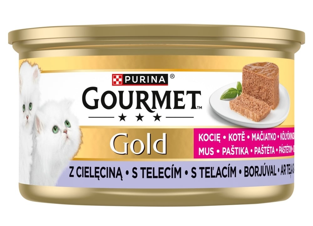 GOURMET Gold Kitten Mousse s teľacím mäsom je kompletné mokré krmivo pre mačiatka, ktoré sa vyznačuje jemnou penovou textúrou a vynikajúcou teľacou chuťou.