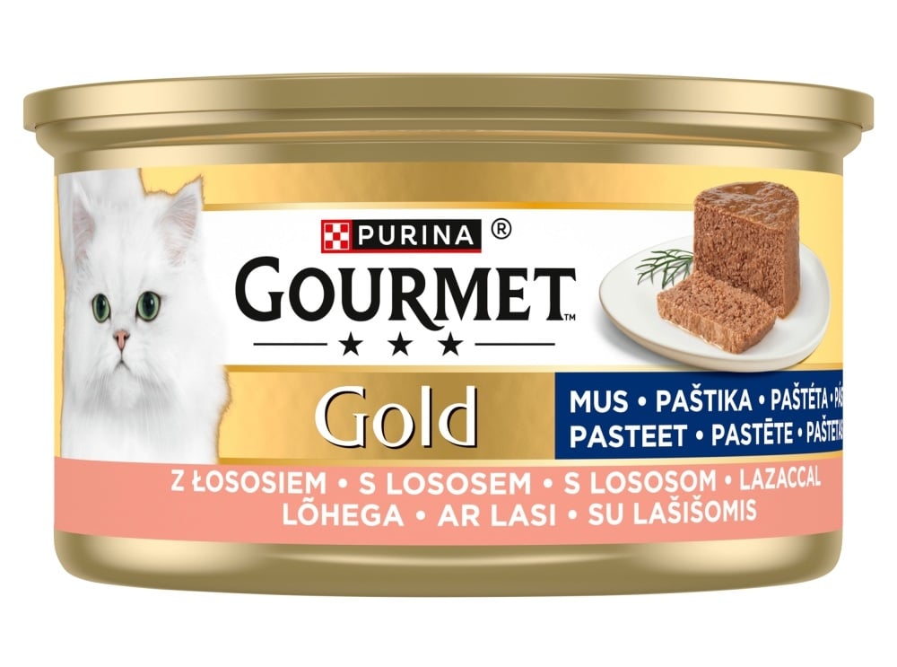 GOURMET Gold Mus s lososom je kompletná mokrá strava pre dospelé mačky, ktorá sa vyznačuje jemnou konzistenciou musu a rafinovanou chuťou lososa.