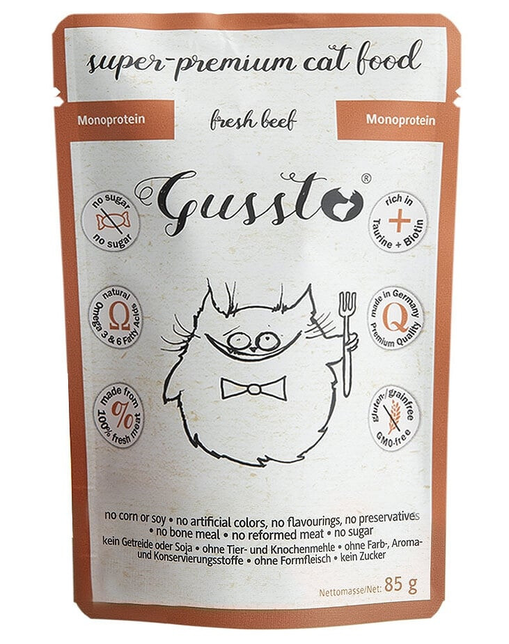 Je vyrobené z najkvalitnejšieho čerstvého mäsa na vysokej úrovni. Obsahuje veľa mäsa, ktoré dokonale zodpovedá špecifickým požiadavkám na krmivo pre mačky. Jedná sa o mono-proteínové krmivo, je holistické, ľahko stráviteľné a veľmi dobre sa vstrebáva, odporúča sa tiež u mačiek s citlivým zažívacím traktom. Používa sa tiež v diétach u potravinových alergií. Perfektne vyvážený pomer vápnika a fosforu minimalizuje riziko ochorenia močového systému a obličiek. Okrem toho obsahuje Gussto veľa esenciálnych vitamínov a minerálov veľmi bohatých na Taurín a biotín a obsahuje užitočný olej z pestreca - bohatého na nenasýtené mastné kyseliny, ktorý má protizápalové účinky, reguluje tráviace a regeneračné funkcie pečene a posilňuje imunitný systém.