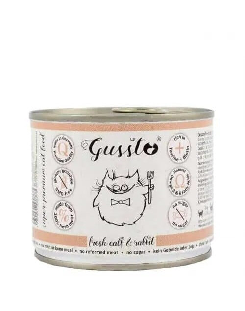 Je vyrobené z najkvalitnejšieho čerstvého mäsa na vysokej úrovni. Obsahuje veľa mäsa, ktoré dokonale zodpovedá špecifickým požiadavkám na krmivo pre mačky. Jedná sa o mono-proteínové krmivo, je holistické, ľahko stráviteľné a veľmi dobre sa vstrebáva, odporúča sa tiež u mačiek s citlivým zažívacím traktom. Používa sa tiež v diétach u potravinových alergií. Perfektne vyvážený pomer vápnika a fosforu minimalizuje riziko ochorenia močového systému a obličiek. Okrem toho obsahuje Gussto veľa esenciálnych vitamínov a minerálov veľmi bohatých na Taurín a biotín a obsahuje užitočný olej z pestreca - bohatého na nenasýtené mastné kyseliny, ktorý má protizápalové účinky, reguluje tráviace a regeneračné funkcie pečene a posilňuje imunitný systém.