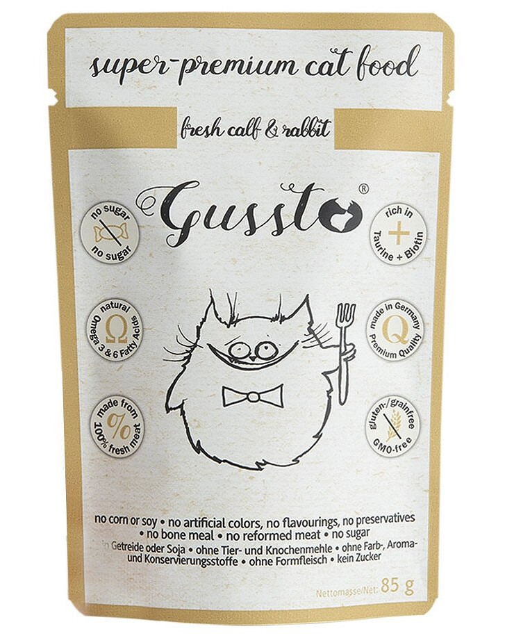 Výrobok obsahuje veľké množstvo mäsa, ktoré dokonale spĺňa špecifické nutričné požiadavky mačiek. Správne vyvážený pomer vápnika a fosforu vám umožní minimalizovať riziko ochorenia obličiek a močových ciest. Krmivo pre mačky Gussto navyše obsahuje komplex vitamínov a minerálov, je bohaté na taurín (2000 mg) a biotín. Pridaný olej z pestreca mariánskeho je zdrojom nenasýtených mastných kyselín, má protizápalové účinky, reguluje trávenie a regeneráciu pečene a posilňuje imunitný systém.