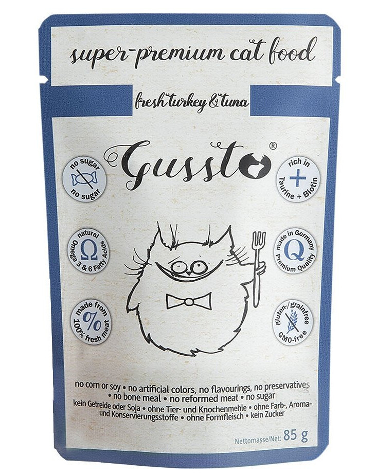 Krmivo je vyrobené z najkvalitnejších surovín a obsahuje 70 % plnohodnotného mäsa a vnútorností z moriaka a tuniaka. Jednoduché zloženie zabezpečuje úplné pokrytie výživových potrieb mačiek ako druhu. Krmivo neobsahuje obilniny ani iné zložky, ktoré mačky neznášajú. Vlastný vývar z mäsa zvyšuje chutnosť a dodáva krmivu charakteristickú štruktúru, ktorú mačky milujú. Ostropestrecový olej zvyšuje tučnosť, takže chutí aj vyberavým mačkám.