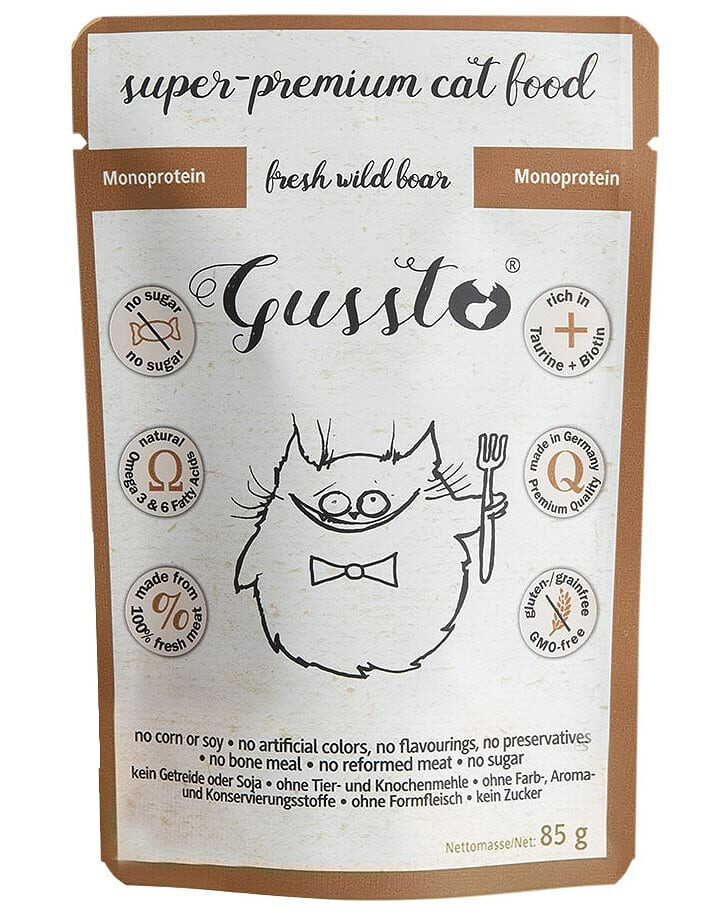Je vyrobené z najkvalitnejšieho čerstvého mäsa na vysokej úrovni. Obsahuje veľa mäsa, ktoré dokonale zodpovedá špecifickým požiadavkám na krmivo pre mačky. Jedná sa o mono-proteínové krmivo, je holistické, ľahko stráviteľné a veľmi dobre sa vstrebáva, odporúča sa tiež u mačiek s citlivým zažívacím traktom. Používa sa tiež v diétach u potravinových alergií. Perfektne vyvážený pomer vápnika a fosforu minimalizuje riziko ochorenia močového systému a obličiek. Okrem toho obsahuje Gussto veľa esenciálnych vitamínov a minerálov veľmi bohatých na Taurín a biotín a obsahuje užitočný olej z pestreca - bohatého na nenasýtené mastné kyseliny, ktorý má protizápalové účinky, reguluje tráviace a regeneračné funkcie pečene a posilňuje imunitný systém.