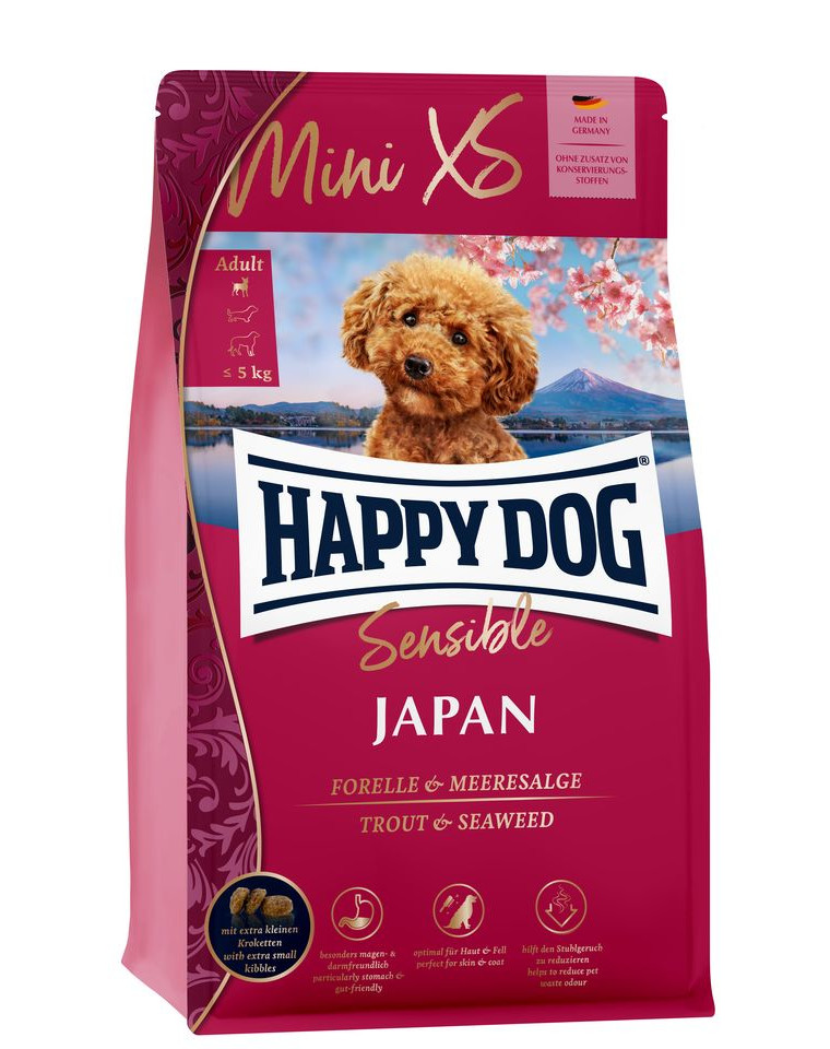 Japonské zloženie so pstruhom, kuracím mäsom a morskými riasami je chuťovým vnemom pre malých psíkov. Bezlepkové a ľahko stráviteľné jedlo, plné vlákniny.