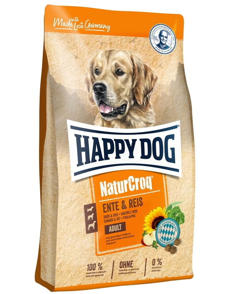 Happy Dog NaturCroq Ente & Reis je kompletné krmivo vyrobené z vysoko kvalitných surovín z bavorského poľnohospodárstva. Chrumkavé krokety obsahujú chutné kačacie mäso ako zdroj cenných živočíšnych bielkovín a ľahko stráviteľnú ryžu, ktorú psy dobre znášajú.
