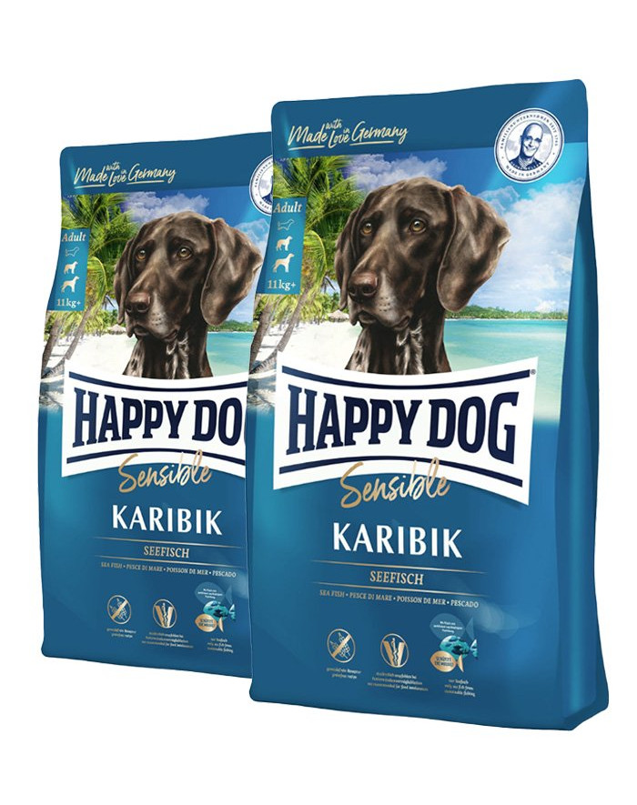 Happy Dog Supreme Sensible Caribbean je krmivo určené pre dospelých psov s alergiami a potravinovou neznášanlivosťou obsahujúcou iba jeden druh bielkovín a bez pridania obilnín. Skladá sa z hlbokomorských rýb z certifikovaného rybolovu a bezlepkových zemiakov, vďaka čomu je to zloženie dobre tolerované a ľahko stráviteľné, ideálne pre všetkých citlivých psov. Bola doplnená hodnotnými Omega-3 a Omega-6 mastnými kyselinami, ktoré sú dôležité pre udržanie zdravej kože a brilantnej srsti vášho domáceho maznáčika.