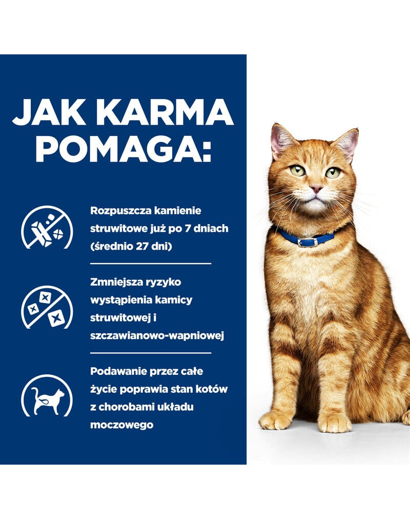 Výživa výrazne znižuje výskyt bežných symptómov močových ciestRozpúšťa struvitové močové kamene už za 7 dní (v priemere za 27 dní)Znižuje riziko vzniku struvitových a kalcium-oxalátových kameňovCeloživotná výživa poskytuje mačkám s príznakmi močových ciest výhody.