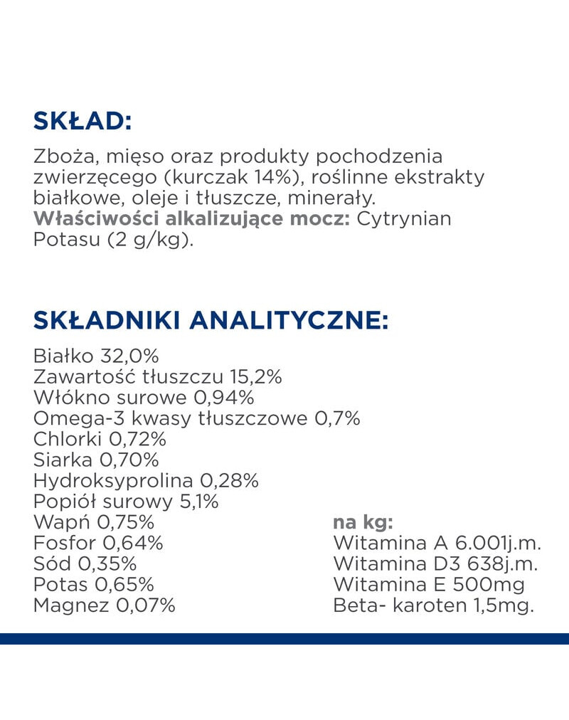 ZLOŽENIE: obilniny, mäso a živočíšne zložky (kuracie mäso 14 %), rastlinné bielkovinové extrakty, oleje a tuky, minerálne látky. Alkalizátory moču: citrát draselný (2 g/kg).