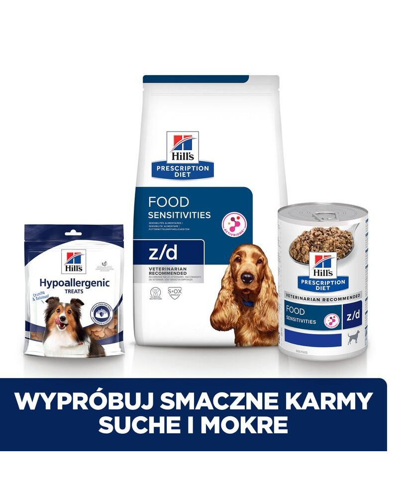 Hill's PRESCRIPTION DIET z/d je kompletné diétne krmivo určené na zníženie neznášanlivosti zložiek a živín u dospelých psov. Toto diétne krmivo obsahuje vybraný zdroj sacharidov a hydrolyzovaný zdroj bielkovín.
