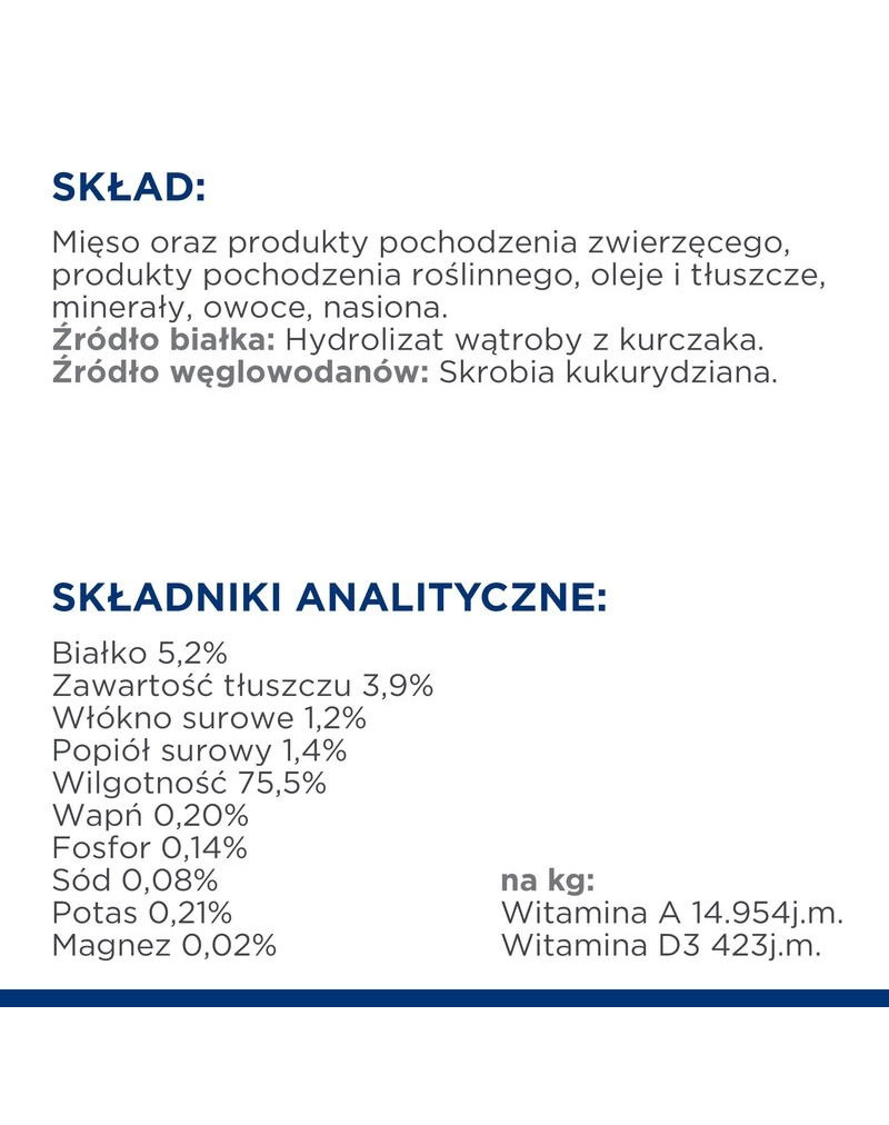 ANALYTICKÉ ZLOŽKY: hrubý proteín 5,2 %, hrubý tuk 3,9 %, hrubá vláknina 1,2 %, esenciálne mastné kyseliny 1,3 %, hrubý popol 1,4 %, vlhkosť 75,5 %, vápnik 0,20 %, fosfor 0,14 %, sodík 0,08 %, draslík 0,21 %, horčík 0,02 %; na kg: vitamín A 14 954 IU, vitamín D3 423 IU.