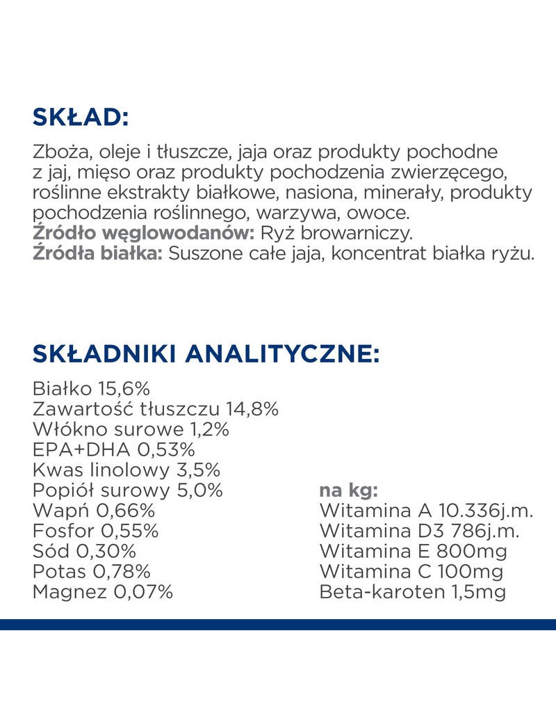 ZLOŽENIE: Obilniny, oleje a tuky (1,8 % rybieho oleja), vajcia a vaječné deriváty, mäso a produkty živočíšneho pôvodu, výťažky rastlinných bielkovín, semienka, minerálne látky, deriváty rastlinného pôvodu, zelenina, ovocie. Zdroje uhľohydrátov: Zlomková ryža, hnedá ryža. Zdroje bielkovín: Sušené celé vajcia, ryžový proteín.