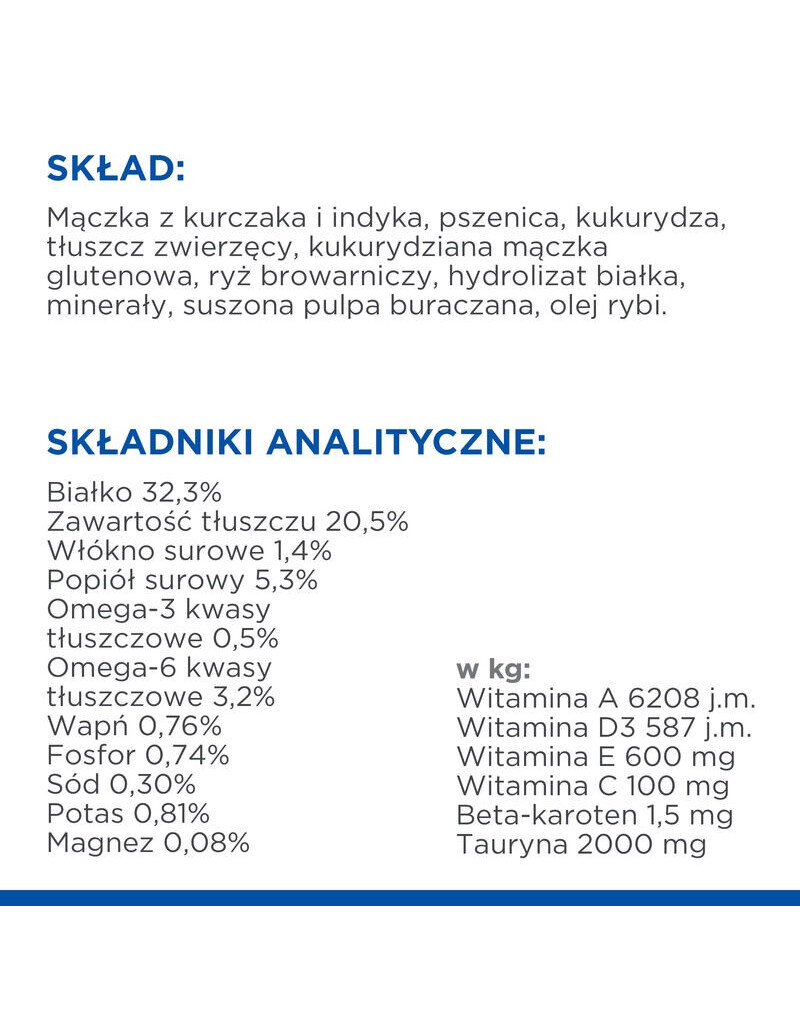 Krmivo obsahuje vysokokvalitné, ľahko stráviteľné zložky. Taurín podporuje zdravú činnosť srdca a vyvážený obsah minerálov podporuje činnosť obličiek a močového mechúra. Vysokokvalitné bielkoviny v krmive podporujú funkciu svalov. Vitamín E a omega-3 a omega-6 mastné kyseliny pomáhajú udržiavať zdravú a krásnu kožu a srsť.