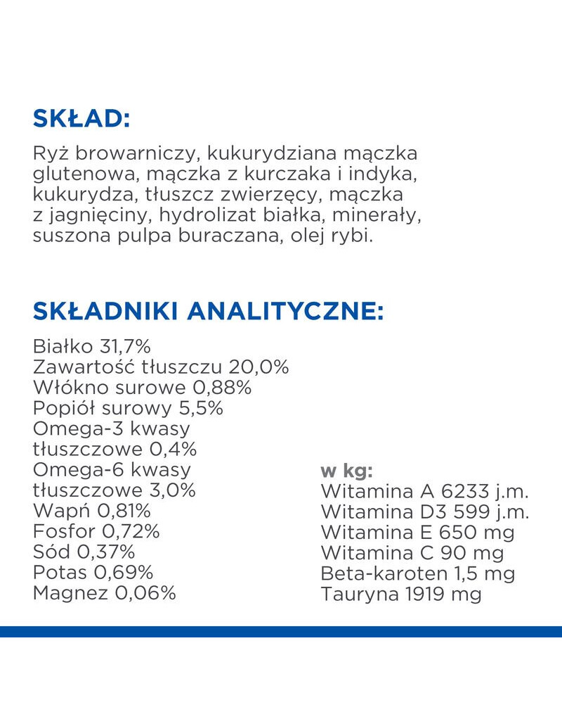 Krmivo obsahuje vysokokvalitné, ľahko stráviteľné zložky. Taurín podporuje zdravú činnosť srdca a vyvážený obsah minerálov podporuje činnosť obličiek a močového mechúra. Vysokokvalitné bielkoviny v krmive podporujú funkciu svalov. Vitamín E a omega-3 a omega-6 mastné kyseliny pomáhajú udržiavať zdravú a krásnu kožu a srsť.