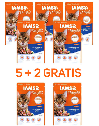 IAMS Pochúťky s morskými rybami a hráškom v želé. 100% kompletné a vyvážené vysokokvalitné krmivo pre dospelé mačky. Plné živín a neodolateľnej chuti. Obsahuje taurín pre zdravé srdce a oči.