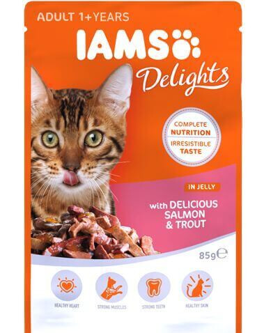 IAMS Delights s chutným pstruhom a lososom v želé. 100% kompletné a vyvážené kvalitné krmivo pre dospelé mačky. Plné živín a neodolateľnej chuti. Obsahuje taurín pre zdravé srdce a oči.