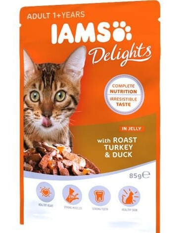 IAMS Delights s pečeným moriakom a kačicou v želé. 100% kompletné a vyvážené kvalitné krmivo pre dospelé mačky. Plné živín a neodolateľnej chuti. Obsahuje taurín pre zdravé srdce a oči.