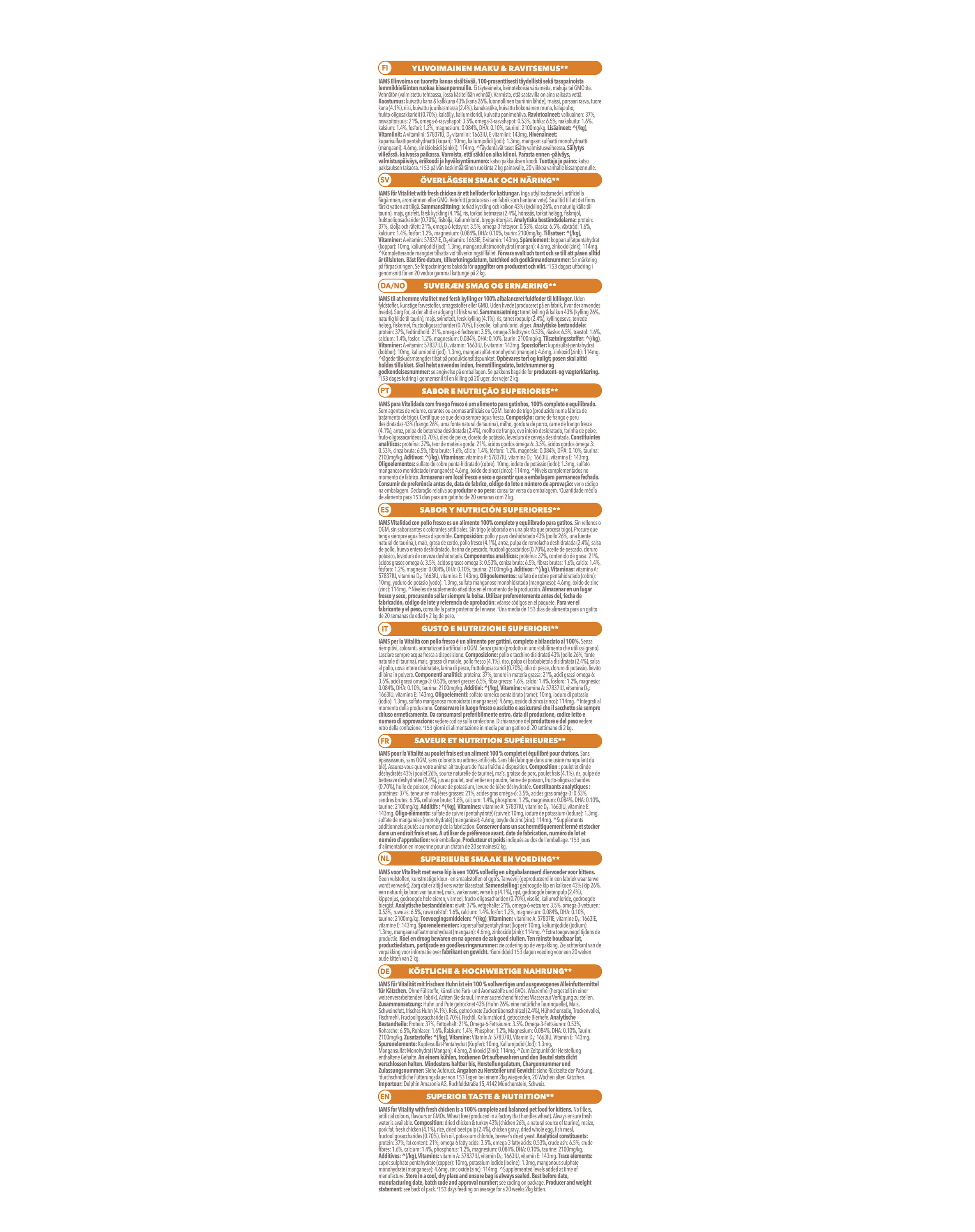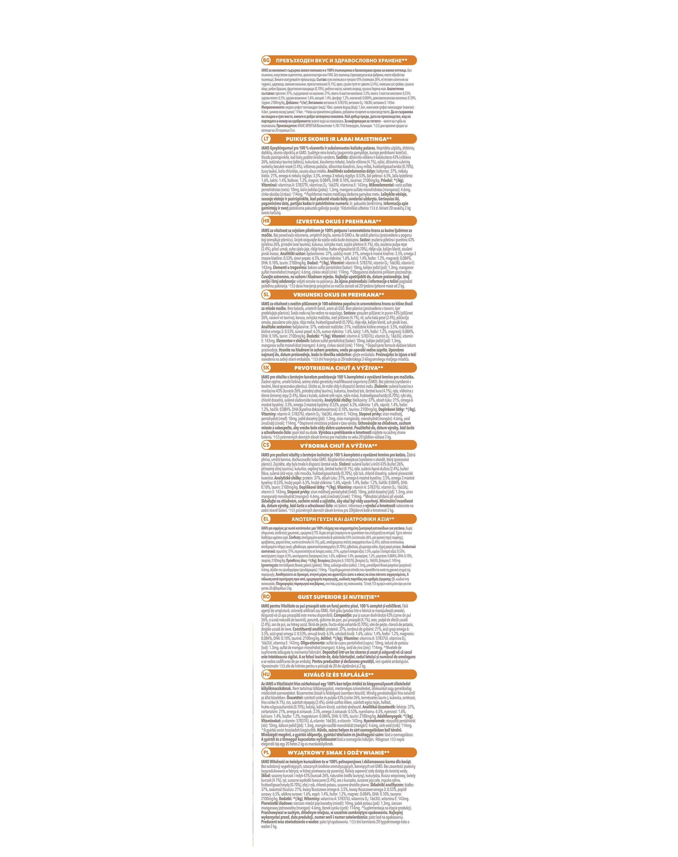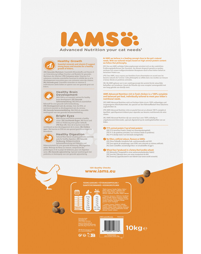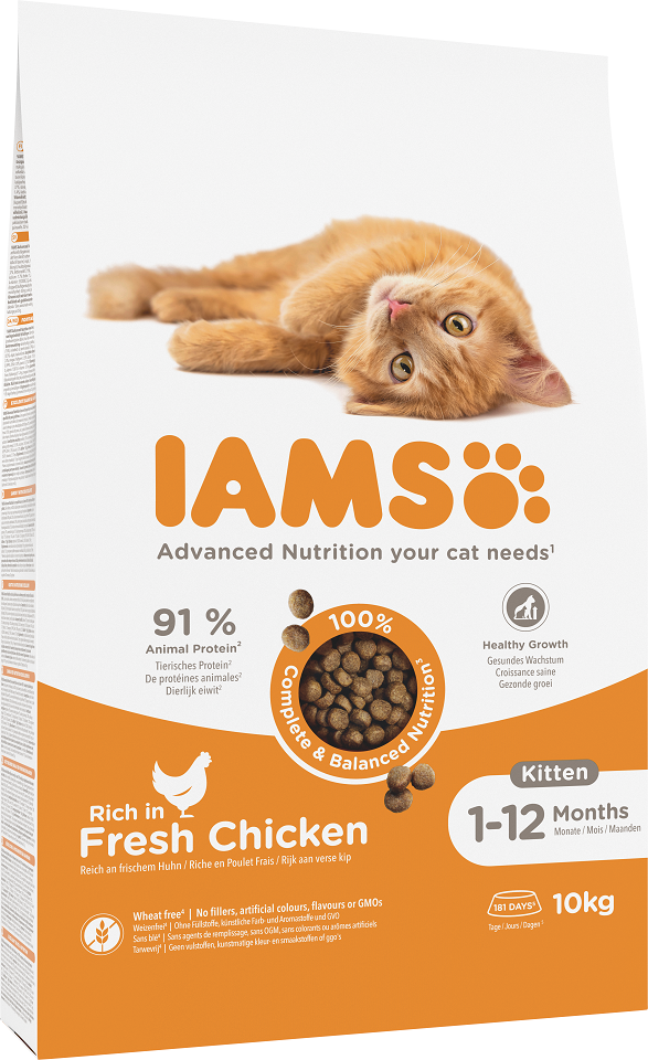 IAMS for Vitality for Kittens with Fresh Chicken je 100% kompletné a vyvážené krmivo. Nová, chutná a vylepšená receptúra obsahuje až 91% živočíšnych bielkovín (z celkového obsahu bielkovín) a všetky zložky potrebné pre rastúce a vyvíjajúce sa mačiatko. Lahodné jedlo neobsahuje žiadne zbytočné prídavné látky, umelé farbivá či príchute, ani GMO. Nová receptúra navyše neobsahuje pšenicu *.