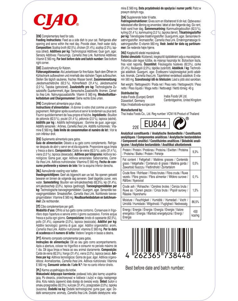 INABA CIAO Stew je doplnkové krmivo pre mačky s kuracím mäsom a mušľami v omáčke.