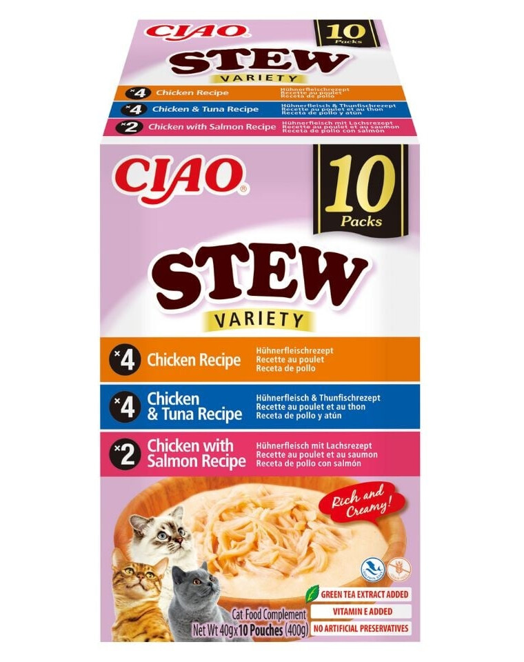 INABA Cat Ciao Stew Variety je chutná, ľahká doplnková strava pre mačky, vo forme jemných mäsových kúskov ponorených v aromatickom, hustom „stew“ – ľahkom guláši/bulióne. Sada obsahuje mix troch variantov: s kuracím, tuniakovým a lososovým mäsom, vďaka čomu sa výborne hodí pre vyberavé mačky alebo ako každodenné spestrenie stravy.
