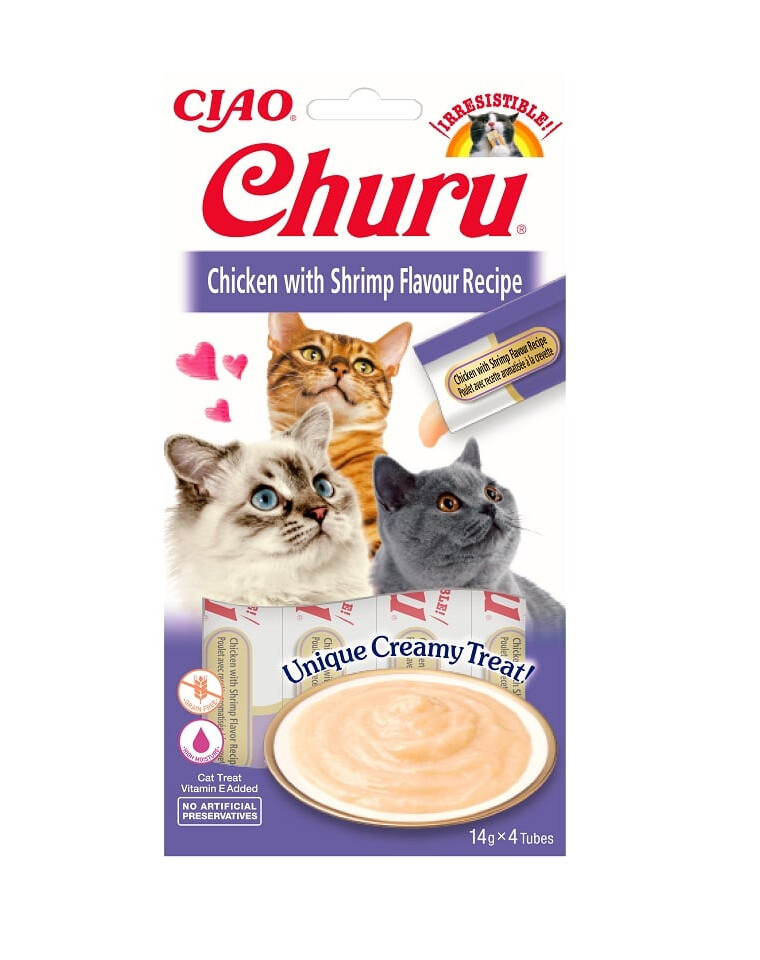 Churu mäsové pyré pre mačky s kuracím a krevetami.