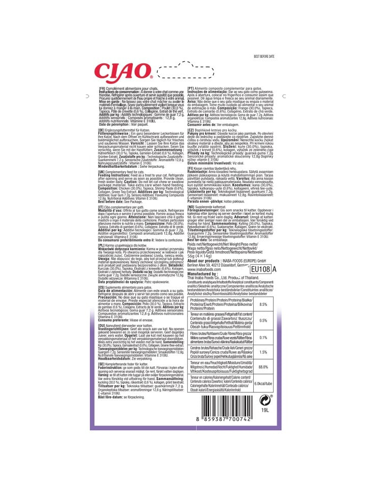 Kuracie mäso 30%, tapioka, prírodný extrakt z kreviet (0,6%),
