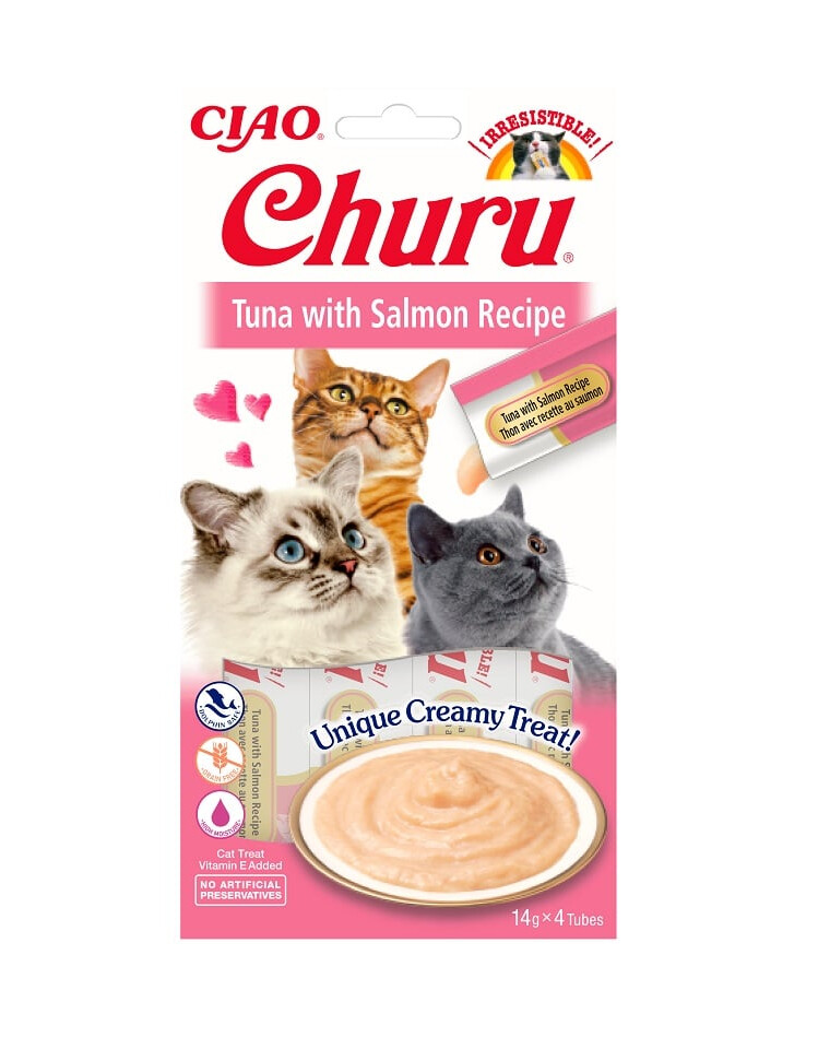 Churu mäsové pyré pre mačky s tuniakom a lososom.
