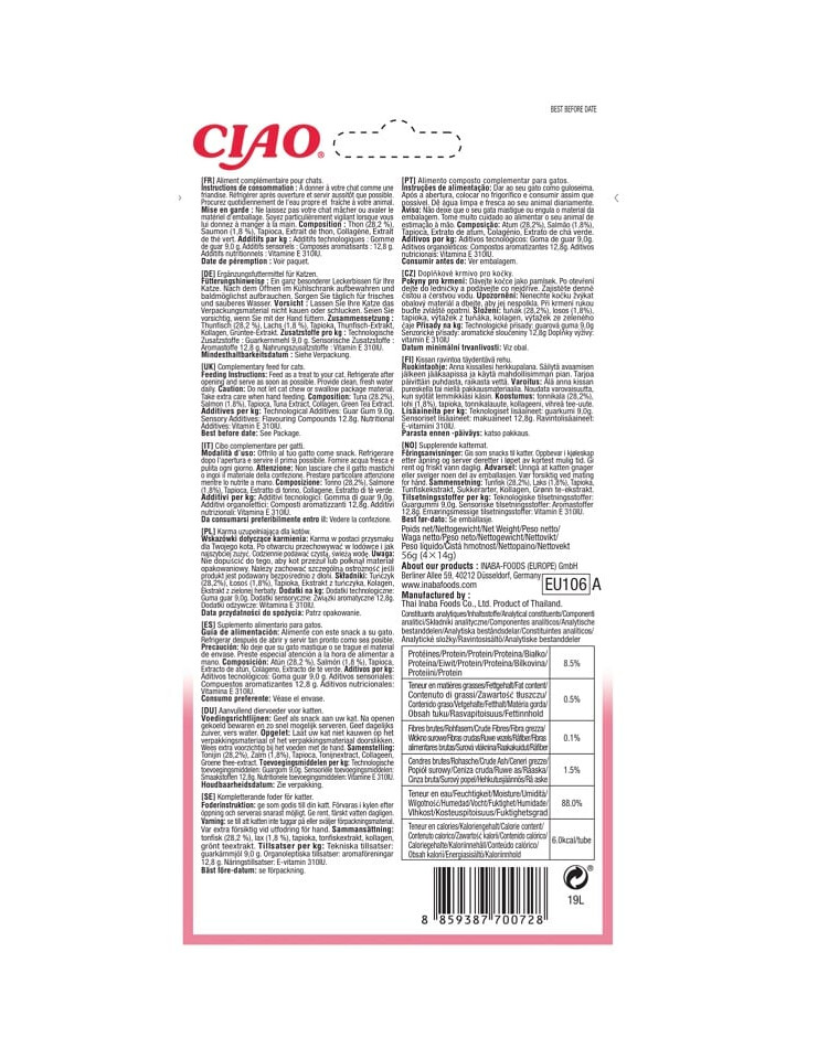 tuniak (28,2 %), losos (1,8 %), tapioka, extrakt z tuniaka,