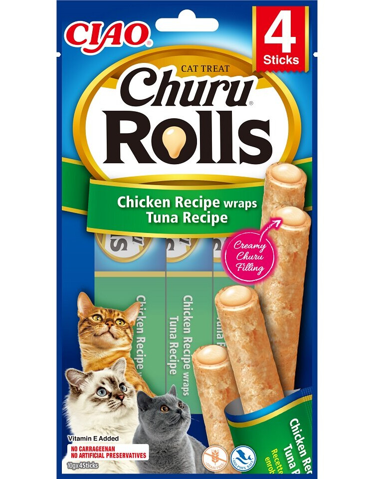 Churu Rolls sú mäkké a prírodné mäsité pochúťky v tvare tyčiniek s mäkkým stredom. Obsahujú prírodné arómy a extrakt zo zeleného čaju a vitamín E. Neobsahujú žiadne obilniny, konzervačné látky ani umelé farbivá.