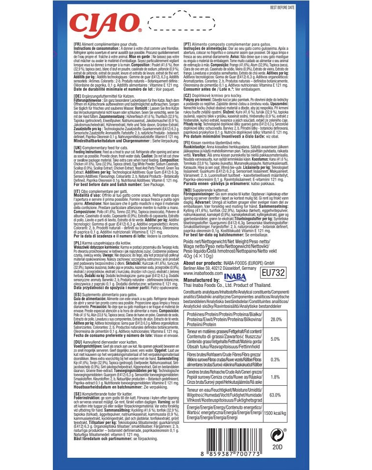 Zloženie: kuracie mäso (41,6 %), tuniak (32,9 %), tapioka (sušená), vaječný bielok v prášku, kazeinát sodný, hrebenatka (0,9 %), extrakt z hrebenatky, kurací extrakt, kvasnicový extrakt, extrakt zo zeleného čaju.