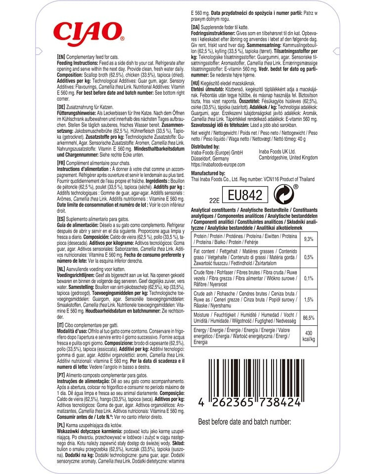 Návod na kŕmenie: Doplnkové krmivo vo forme pochúťky pre vašu mačku. Tento výrobok by sa mal podávať len ako doplnok k inému krmivu alebo medzi jedlami. Zabezpečte vašej mačke stály prístup k miske s čerstvou vodou. Skladujte na suchom a chladnom mieste, mimo dosahu priameho slnečného svetla. Po otvorení skladujte v chladničke a spotrebujte čo najskôr.