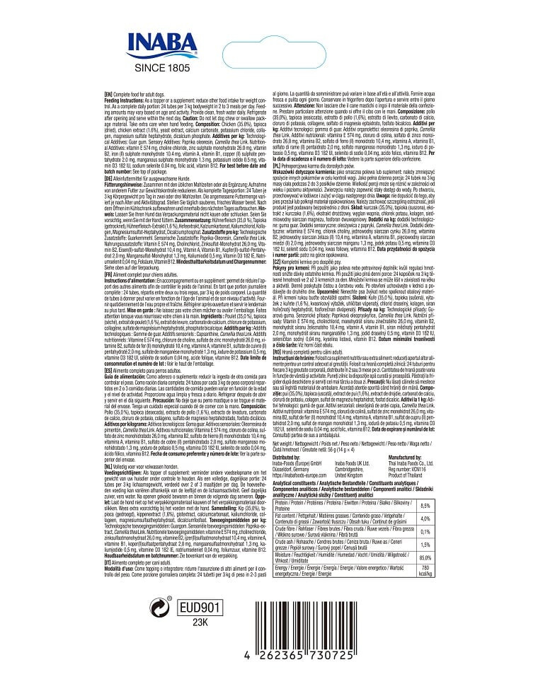 Zloženie: kuracie mäso (35,0 %), tapioka (sušená), kurací extrakt (1,6 %), kvasnicový extrakt, uhličitan vápenatý, chlorid draselný, kolagén, heptahydrát síranu horečnatého, fosforečnan vápenatý. Prísady na 1 kg: Technologické prísady: guarová guma. Senzorické prísady: paprikový oleoresin, Camellia thea Link. Výživové doplnkové látky: vitamín E 574 mg, cholínchlorid, síran zinočnatý monohydrát 26,0 mg, vitamín B2, síran železnatý (II) monohydrát 10,4 mg, vitamín A, vitamín B1, síran meďnatý (II) pentahydrát 2,0 mg, síran mangánatý monohydrát 1,3 mg, jodid draselný 0,5 mg, vitamín D3 182 IU, seleničitan sodný 0,04 mg, kyselina listová, vitamín B12.