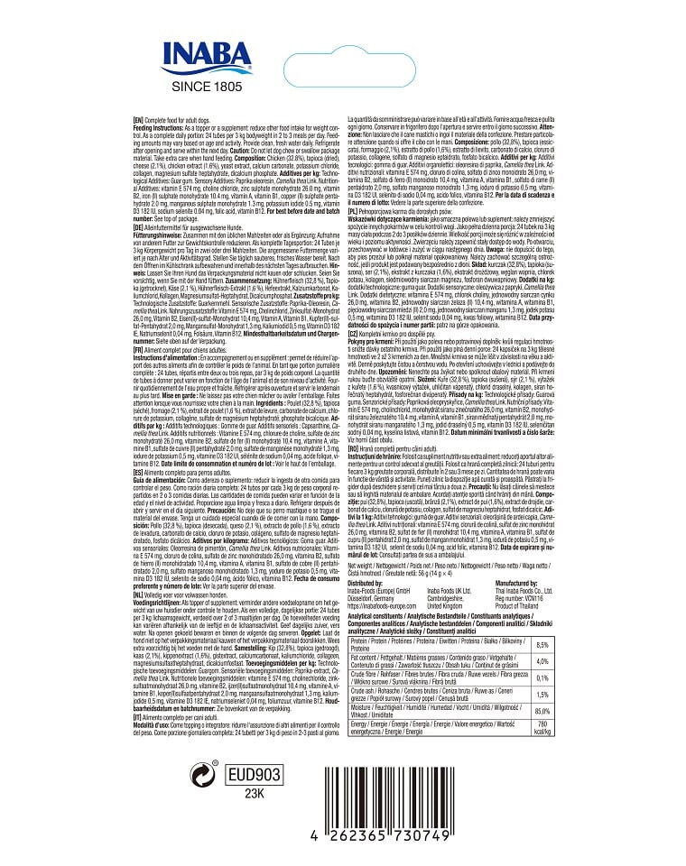 Zloženie: kuracie mäso (32,8 %), tapioka (sušená), syr (2,1 %), kurací extrakt (1,6 %), kvasnicový extrakt, uhličitan vápenatý, chlorid draselný, kolagén, heptahydrát síranu horečnatého, fosforečnan vápenatý. Prísady na 1 kg: Technologické prísady: guarová guma. Senzorické prísady: paprikový oleoresin, Camellia thea Link. Výživové doplnkové látky: vitamín E 574 mg, cholínchlorid, síran zinočnatý monohydrát 26,0 mg, vitamín B2, síran železnatý (II) monohydrát 10,4 mg, vitamín A, vitamín B1, síran meďnatý (II) pentahydrát 2,0 mg, síran mangánatý monohydrát 1,3 mg, jodid draselný 0,5 mg, vitamín D3 182 IU, seleničitan sodný 0,04 mg, kyselina listová, vitamín B12.