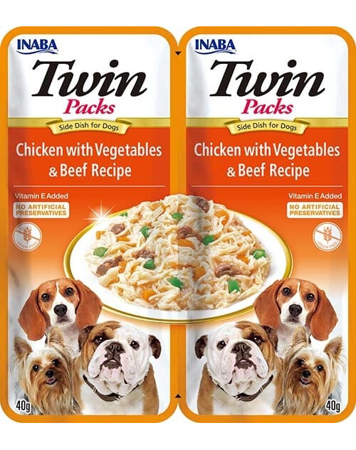 Doplnkové krmivo pre psov. Receptúra s kuracím mäsom, zeleninou a hovädzím mäsom v kuracom vývare.