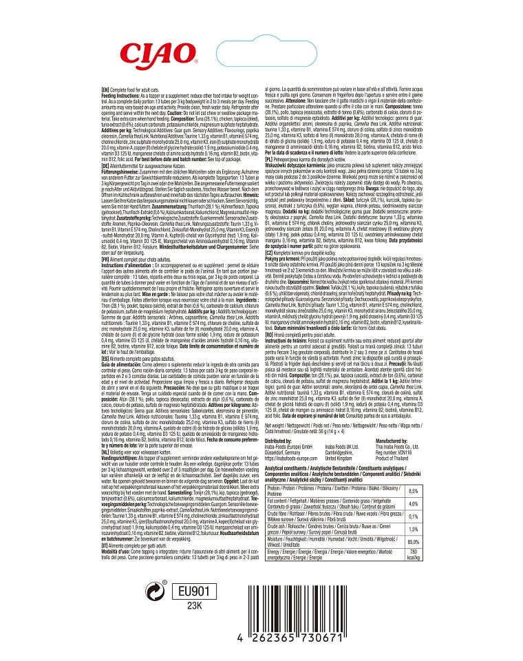 Zloženie: tuniak (28,1 %), kuracie mäso, tapioka (sušená), extrakt z tuniaka (0,6 %), uhličitan vápenatý, chlorid draselný, heptahydrát síranu horečnatého. Prísady na 1 kg: Technologické prísady: guarová guma. Senzorické prísady: arómy, paprikový oleorezín, Camellia thea Link. Diétne prídavné látky: Taurín 1,33 g, vitamín B1, vitamín E 574 mg, cholínchlorid, síran zinočnatý monohydrát 25,0 mg, vitamín K3, síran železnatý (II) monohydrát 20,0 mg, vitamín A, chelát medi (II) hydrát glycínu (tuhý) 1,9 mg, jodid draselný 0,4 mg, vitamín D3 125 IU, chelát aminokyseliny mangánovej hydrát 0,16 mg, vitamín B2, biotín, vitamín B12, kyselina listová.