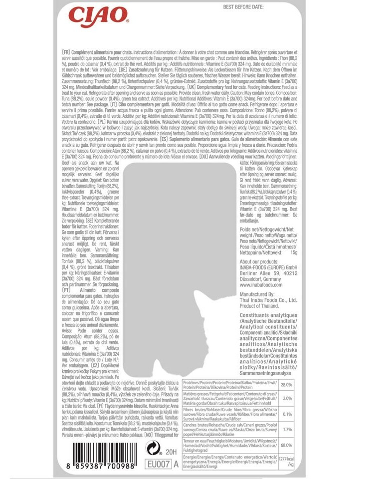 Zloženie: tuniak (88,2 %), kalamáre v prášku (0,4 %), extrakt zo zeleného čaju