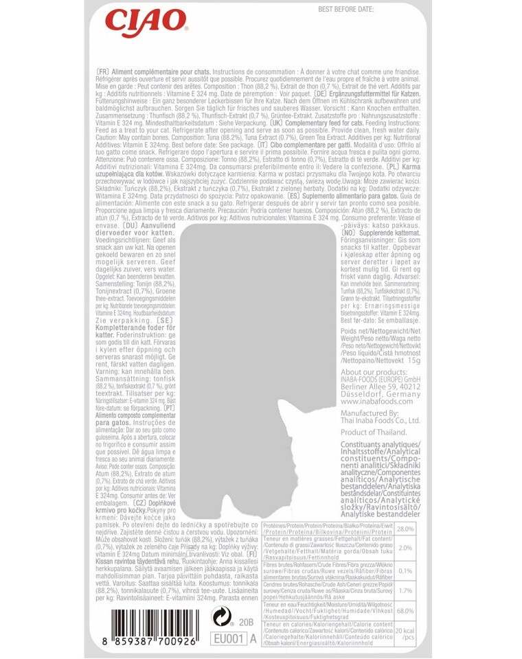 Zloženie: tuniak (88,2 %), extrakt z tuniaka (0,7 %), extrakt zo zeleného čaju